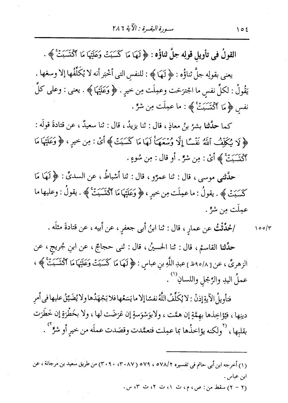 حَدَّثَنَا الْقَاسِمُ، قَالَ: ثنا الْحُسَيْنُ، قَالَ: ثني حَجَّاجٌ، عَنِ ابْنِ جُرَيْجٍ، عَنِ الزُّهْرِيِّ، عَنْ عَبْدِ اللَّهِ بْنِ عَبَّاسٍ: {§لَهَا مَا كَسَبَتْ وَعَلَيْهَا مَا اكْتَسَبَتْ} [البقرة: 286] «عَمَلُ الْيَدِ وَالرِّجْلِ وَاللِّسَانِ» فَتَأْوِيلُ الْآيَةِ إِذًا: لَا يُكَلِّفُ اللَّهُ نَفْسًا إِلَّا مَا يَسَعُهَا، فَلَا يُجْهِدُهَا، وَلَا يُضَيِّقُ عَلَيْهَا فِي أَمْرِ دِينِهَا، فَيُؤَاخِذُهَا بِهِمَّةٍ إِنْ هَمَّتْ، وَلَا بِوَسْوَسَةٍ إِنْ عَرَضَتْ لَهَا، وَلَا بِخَطْرَةٍ إِنْ خَطَرَتْ بِقَلْبِهَا