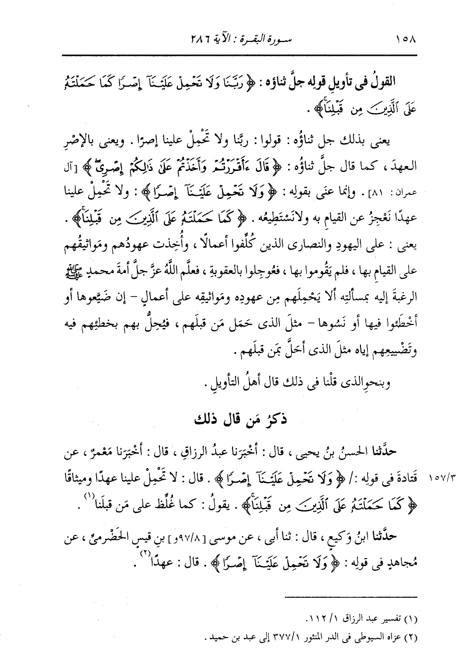 §الْقَوْلُ تَأْوِيلِ قَوْلِهِ تَعَالَى: {رَبَّنَا وَلَا تَحْمِلْ عَلَيْنَا إِصْرًا كَمَا حَمَلْتَهُ عَلَى الَّذِينَ مِنْ قَبْلِنَا} [البقرة: 286] يَعْنِي بِذَلِكَ جَلَّ ثناؤُهُ: قُولُوا: رَبَّنَا لَا تَحْمِلْ عَلَيْنَا إِصْرًا: يَعْنِي بِالْإِصْرِ الْعَهْدَ، كَمَا قَالَ جَلَّ ثناؤُهُ: {قَالَ أَأَقْرَرْتُمْ وَأَخَذْتُمْ عَلَى ذَلِكُمْ إِصْرِي} [آل عمران: 81] وَإِنَّمَا عَنَى بِقَوْلِهِ: {وَلَا تَحْمِلْ عَلَيْنَا إِصْرًا} [البقرة: 286] وَلَا تَحْمِلْ عَلَيْنَا عَهْدًا فَنَعْجَزُ عَنِ الْقِيَامِ بِهِ وَلَا نَسْتَطِيعُهُ {كَمَا حَمَلْتَهُ عَلَى الَّذِينَ مِنْ قَبْلِنَا} [البقرة: 286] يَعْنِي عَلَى الْيَهُودِ وَالنَّصَارَى الَّذِينَ كُلِّفُوا أَعْمَالًا وَأُخِذَتْ عُهُودُهُمْ وَمَوَاثِيقُهُمْ عَلَى الْقِيَامِ بِهَا، فَلَمْ يَقُومُوا بِهَا، فَعُوجِلُوا بِالْعُقُوبَةِ، فَعَلَّمَ اللَّهُ عَزَّ وَجَلَّ أُمَّةَ مُحَمَّدٍ صَلَّى اللهُ عَلَيْهِ وَسَلَّمَ الرَّغْبَةَ إِلَيْهِ بِمَسْأَلَتِهِ أَنْ لَا يَحْمِلَهُمْ مِنْ عُهُودِهِ وَمَوَاثِيقِهِ عَلَى أَعْمَالٍ أَنْ ضَيَّعُوهَا أَوْ أَخْطَئُوا فِيهَا أَوْ نَسُوهَا مِثْلَ الَّذِي حَمَّلَ مَنْ قَبْلَهُمْ، فَيَحِلُّ بِهِمْ بِخَطَئِهِمْ فِيهِ وَتَضْيِيعِهِمْ إِيَّاهُ مِثْلَ الَّذِي أَحَلَّ بِمَنْ قَبْلَهُمْ. وَبِنَحْوِ الَّذِي قُلْنَا فِي ذَلِكَ قَالَ أَهْلُ التَّأْوِيلِ