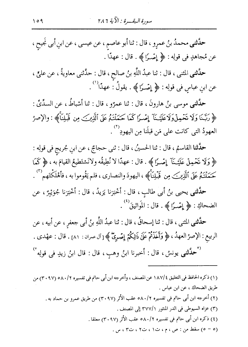 حَدَّثَنِي الْمُثَنَّى، قَالَ: ثنا عَبْدُ اللَّهِ، قَالَ: ثنا مُعَاوِيَةُ، عَنْ عَلِيٍّ، عَنِ ابْنِ عَبَّاسٍ، فِي قَوْلِهِ: {§إِصْرًا} [البقرة: 286] يَقُولُ: «عَهْدًا»