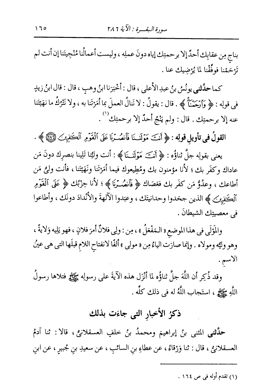 §الْقَوْلُ فِي تَأْوِيلِ قَوْلِهِ تَعَالَى: {أَنْتَ مَوْلَانَا فَانْصُرْنَا عَلَى الْقَوْمِ الْكَافِرِينَ} [البقرة: 286] يَعْنِي بِقَوْلِهِ جَلَّ ثناؤُهُ: {أَنْتَ مَوْلَانَا} [البقرة: 286] أَنْتَ وَلِيُّنَا بُنَصْرُكَ دُونَ مَنْ عَادَاكَ وَكَفَرَ بِكَ، لَأَنَّا مُؤْمِنُونَ بِكَ وَمُطِيعُوكَ فِيمَا أَمَرْتَنَا وَنَهَيْتَنَا، فَأَنْتَ وَفِيُّ مَنْ أَطَاعَكَ، وَعَدُوُّ مَنْ كَفَرَ بِكَ فَعَصَاكَ، فَانْصُرْنَا لَأَنَّا حِزْبُكَ، عَلَى الْقَوْمِ الْكَافِرِينَ الَّذِي جَحَدُوا وَحْدَانِيَّتَكَ، وَعَبَدُوا الْآلِهَةَ وَالْأَنْدَادَ دُونَكَ، وَأَطَاعُوا فِي مَعْصِيَتِكَ الشَّيْطَانَ وَالْمَوْلَى فِي هَذَا الْمَوْضِعِ الْمَفْعَلُ مِنْ وَلِيَ فُلَانٌ أَمْرَ فُلَانٍ فَهُوَ يَلِيهِ وِلَايَةً، وَهُوَ وَلِيُّهُ وَمَوْلَاهُ، وَإِنَّمَا صَارَتِ الْيَاءُ مِنْ وَلِي أَلْفًا لِانْفِتَاحِ اللَّامِ قَبْلَهَا الَّتِي هِيَ عَيْنُ الِاسْمِ. وَقَدْ ذَكَرُوا أَنَّ اللَّهَ عَزَّ وَجَلَّ لَمَّا أَنْزَلَ هَذِهِ الْآيَةَ عَلَى رَسُولِ اللَّهِ صَلَّى اللهُ عَلَيْهِ وَسَلَّمَ، فَتَلَاهَا رَسُولُ اللَّهِ صَلَّى اللهُ عَلَيْهِ وَسَلَّمَ، اسْتَجَابَ اللَّهُ لَهُ فِي ذَلِكَ كُلِّهِ. ذِكْرُ الْأَخْبَارِ الَّتِي جَاءَتْ بِذَلِكَ: