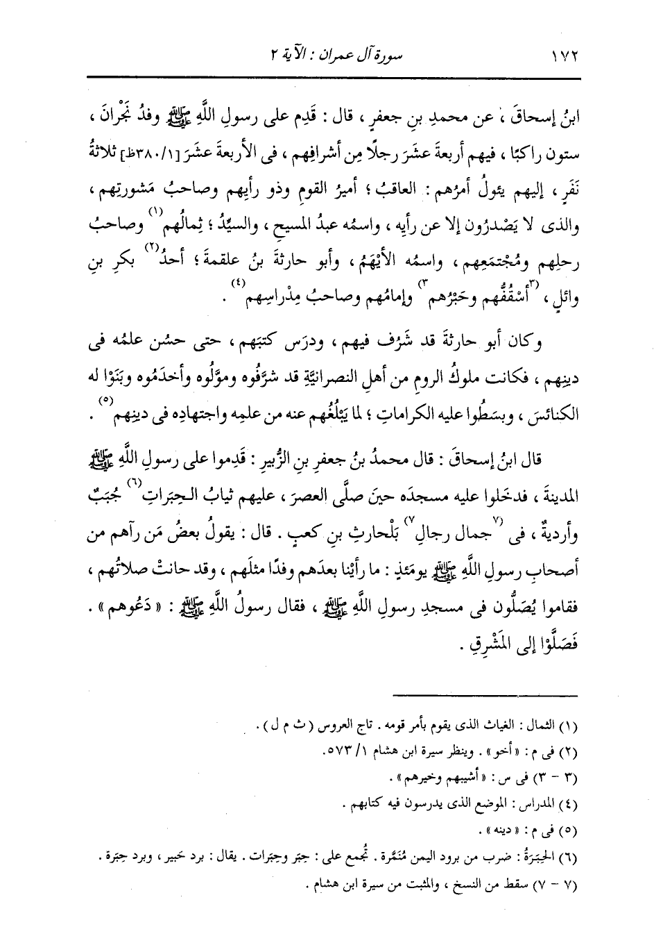 بْنُ إِسْحَاقَ , عَنْ مُحَمَّدِ بْنِ جَعْفَرٍ، قَالَ: قَدِمَ عَلَى رَسُولِ اللَّهِ صَلَّى اللهُ عَلَيْهِ وَسَلَّمَ وَفْدُ نَجْرَانَ سِتُّونَ رَاكِبًا , فِيهِمْ أَرْبَعَةَ عَشَرَ رَجُلًا مِنْ أَشْرَافِهِمْ , فِي الْأَرْبَعَةِ عَشَرَ ثَلَاثَةُ نَفَرٍ إِلَيْهِمْ يَؤُوُلُ أَمْرُهُمْ: الْعَاقِبُ أَمِيرُ الْقَوْمِ وَذُو رَأْيِهِمْ , وَصَاحِبُ مَشُورَتِهِمْ، وَالَّذِي لَا يَصْدُرُونَ إِلَّا عَنْ رَأْيِهِ , وَاسْمُهُ عَبْدُ الْمَسِيحِ. وَالسَّيِّدُ ثِمَالُهُمْ , وَصَاحِبُ رَحْلِهِمْ وَمُجْتَمَعِهِمْ , وَاسْمُهُ الْأَيْهَمُ. وَأَبُو حَارِثَةَ بْنُ عَلْقَمَةَ أَخُو بَكْرِ بْنِ وَائِلٍ , أُسْقُفُهُمْ وَحَبْرُهُمْ وَإِمَامُهُمْ وَصَاحِبُ مِدْرَاسِهِمْ. وَكَانَ أَبُو حَارِثَةَ قَدْ شَرُفَ فِيهِمْ وَدَرَسَ كُتُبَهُمْ حَتَّى حَسُنَ عِلْمُهُ فِي دِينِهِمْ , فَكَانَتْ مُلُوكُ الرُّومِ مِنْ أَهْلِ النَّصْرَانِيَّةِ قَدْ شَرَّفُوهُ وَمَوَّلُوهُ وَأَخْدَمُوهُ , وَبَنَوْا لَهُ الْكَنَائِسَ , وَبَسَطُوا عَلَيْهِ الْكَرَامَاتِ , لِمَا يَبْلُغُهُمْ عَنْهُ مِنْ عِلْمِهِ وَاجْتِهَادِهِ فِي دِينِهِ. قَالَ ابْنُ إِسْحَاقَ: قَالَ مُحَمَّدُ بْنُ جَعْفَرِ بْنِ الزُّبَيْرِ: قَدِمُوا عَلَى رَسُولِ اللَّهِ صَلَّى اللهُ عَلَيْهِ وَسَلَّمَ الْمَدِينَةَ , فَدَخَلُوا عَلَيْهِ فِي مَسْجِدِهِ حِينَ صَلَّى الْعَصْرَ , عَلَيْهِمْ ثِيَابُ الْحِبَرَاتِ جُبَبٌ وَأَرْدِيَةٌ فِي بِلْحَارِثِ بْنِ كَعْبٍ. قَالَ: يَقُولُ بَعْضُ مَنْ رَآهُمْ مِنْ أَصْحَابِ رَسُولِ اللَّهِ صَلَّى اللهُ عَلَيْهِ وَسَلَّمَ يَوْمَئِذٍ: مَا رَأَيْنَا بَعْدَهُمْ وَفْدًا مِثْلَهُمْ. وَقَدْ حَانَتْ صَلَاتُهُمْ , فَقَامُوا يُصَلُّونَ فِي مَسْجِدِ رَسُولِ اللَّهِ صَلَّى اللهُ عَلَيْهِ وَسَلَّمَ، فَقَالَ رَسُولُ اللَّهِ صَلَّى اللهُ عَلَيْهِ وَسَلَّمَ: «دَعُوهُمْ» ، فَصَلَّوْا إِلَى الْمَشْرِقِ.
