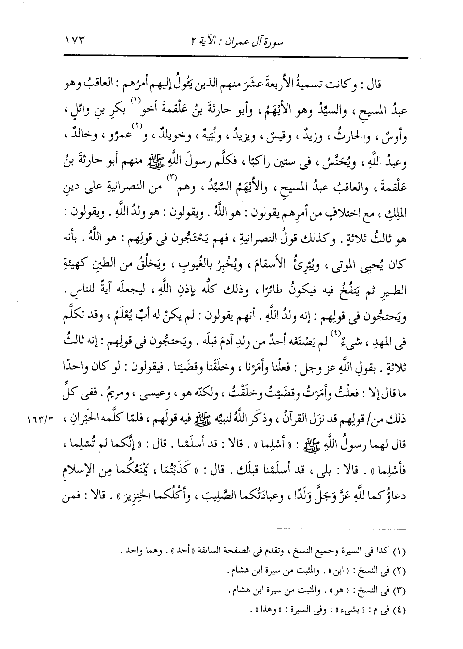 قَالَ: وَكَانَتْ تَسْمِيَةُ الْأَرْبَعَةَ عَشَرَ مِنْهُمُ الَّذِينَ يَؤُوُلُ إِلَيْهِمْ أَمْرُهُمْ: الْعَاقِبُ وَهُوَ عَبْدُ الْمَسِيحِ , وَالسَّيِّدُ وَهُوَ الْأَيْهَمُ , وَأَبُو حَارِثَةَ بْنُ عَلْقَمَةَ أَخُو بَكْرِ بْنِ وَائِلٍ , وَأَوْسٌ , وَالْحَارِثُ , وَزَيْدٌ , وَقَيْسٌ , وَيَزِيدُ , وَنَبِيهٌ , وَخُوَيْلِدُ بْنُ عَمْرٍو , وَخَالِدٌ , وَعَبْدُ اللَّهِ , وَيُحَنَّسُ، فِي سِتِّينَ رَاكِبًا. فَكَلَّمَ رَسُولَ اللَّهِ صَلَّى اللهُ عَلَيْهِ وَسَلَّمَ مِنْهُمْ أَبُو حَارِثَةَ بْنُ عَلْقَمَةَ , وَالْعَاقِبُ عَبْدُ الْمَسِيحِ , وَالْأَيْهَمُ السَّيِّدُ , وَهُمْ مِنَ النَّصْرَانِيَّةِ عَلَى دِينِ الْمَلِكِ مَعَ اخْتِلَافٍ مِنْ أَمْرِهِمْ، يَقُولُونَ: هُوَ اللَّهُ , وَيَقُولُونَ: هُوَ وَلَدُ اللَّهِ , وَيَقُولُونَ: هُوَ ثَالِثُ ثَلَاثَةٍ , وَكَذَلِكَ قَوْلُ النَّصْرَانِيَّةِ. فَهُمْ يَحْتَجُّونَ فِي قَوْلِهِمْ: هُوَ اللَّهُ , بِأَنَّهُ كَانَ يُحْيِي الْمَوْتَى , وَيُبْرِئُ الْأَسْقَامَ , وَيُخْبِرُ بِالْغُيُوبِ , وَيَخْلُقُ مِنَ الطِّينِ كَهَيْئَةِ الطَّيْرِ , ثُمَّ يَنْفُخُ فِيهِ فَيَكُونُ طَائِرًا , وَذَلِكَ كُلُّهُ بِإِذْنِ اللَّهِ , لِيَجْعَلَهُ آيَةً لِلنَّاسِ. وَيَحْتَجُّونَ فِي قَوْلِهِمْ: إِنَّهُ وَلَدُ اللَّهِ , أَنَّهُمْ يَقُولُونَ: لَمْ يَكُنْ لَهُ أَبٌ يُعْلَمُ , وَقَدْ تَكَلَّمَ فِي الْمَهْدِ بِشَيْءٍ لَمْ يَصْنَعْهُ أَحَدٌ مِنْ وَلَدِ آدَمَ مِنْ قَبْلِهِ. وَيَحْتَجُّونَ فِي قَوْلِهِمْ: إِنَّهُ ثَالِثُ ثَلَاثَةٍ , بِقَوْلِ اللَّهِ عَزَّ وَجَلَّ: «فَعَلْنَا» وَ «أَمَرْنَا» وَ «خَلَقْنَا» وَ «قَضَيْنَا» فَيَقُولُونَ: لَوْ كَانَ وَاحِدًا مَا قَالَ إِلَّا «فَعَلْتُ» وَ «أَمَرْتُ» وَ «قَضَيْتُ» وَ «خَلَقْتُ» وَلَكِنَّهُ هُوَ وَعِيسَى وَمَرْيَمُ. فَفِي كُلِّ ذَلِكَ مِنْ قَوْلِهِمْ قَدْ نَزَلَ الْقُرْآنُ , وَذَكَرَ اللَّهُ لِنَبِيِّهِ صَلَّى اللهُ عَلَيْهِ وَسَلَّمَ فِيهِ قَوْلَهُمْ. فَلَمَّا كَلَّمَهُ الْحَبْرَانِ قَالَ لَهُمَا رَسُولُ اللَّهِ صَلَّى اللهُ عَلَيْهِ وَسَلَّمَ: «أَسْلِمَا» ، قَالَا: قَدْ أَسْلَمْنَا، قَالَ: «إِنَّكُمَا لَمْ تُسْلِمَا , فَأَسْلِمَا» ، قَالَا: بَلَى قَدْ أَسْلَمْنَا قَبْلَكَ، قَالَ: «كَذَبْتُمَا , يَمْنَعُكُمَا مِنَ الْإِسْلَامِ دُعَاؤُكُمَا لِلَّهِ عَزَّ وَجَلَّ وَلَدًا , وَعِبَادَتُكُمَا الصَّلِيبَ , وَأَكْلُكُمَا الْخِنْزِيرَ» ، قَالَا: فَمَنْ