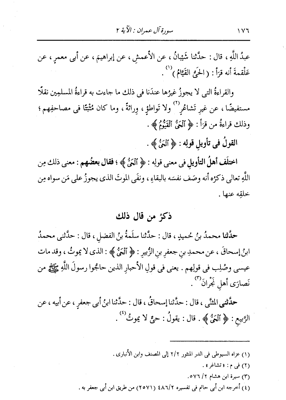 ذِكْرُ مَنْ قَالَ ذَلِكَ: حَدَّثَنَا مُحَمَّدُ بْنُ حُمَيْدٍ، قَالَ: ثنا سَلَمَةُ بْنُ الْفَضْلِ، قَالَ: ثني مُحَمَّدُ بْنُ إِسْحَاقَ , عَنْ مُحَمَّدِ بْنِ جَعْفَرِ بْنِ الزُّبَيْرِ: {§الْحَيُّ} [آل عمران: 2] «الَّذِي لَا يَمُوتُ , وَقَدْ مَاتَ عِيسَى وَصُلِبَ فِي قَوْلِهِمْ , يَعْنِي فِي قَوْلِ الْأَحْبَارِ الَّذِينَ حَاجُّوا رَسُولَ اللَّهِ صَلَّى اللهُ عَلَيْهِ وَسَلَّمَ مِنْ نَصَارَى أَهْلِ نَجْرَانَ»