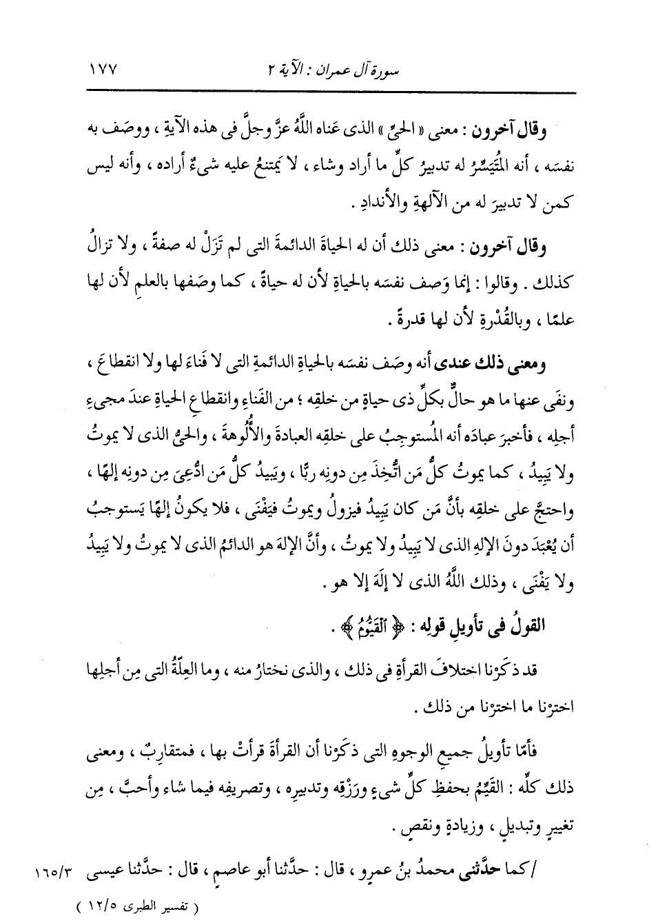 §الْقَوْلُ فِي تَأْوِيلِ قَوْلِهِ تَعَالَى: {الْقَيُّومُ} [البقرة: 255] قَدْ ذَكَرْنَا اخْتِلَافَ الْقِرَاءَةِ فِي ذَلِكَ، وَالَّذِي نَخْتَارُ مِنْهُ , وَمَا الْعِلَّةُ الَّتِي مِنْ أَجْلِهَا اخْتَرْنَا مَا اخْتَرْنَا مِنْ ذَلِكَ. فَأَمَّا تَأْوِيلُ جَمِيعِ الْوُجُوهِ الَّتِي ذَكَرْنَا أَنَّ الْقُرَّاءَ قَرَأَتْ بِهَا فَمُتَقَارِبٌ , وَمَعْنَى ذَلِكَ كُلِّهِ: الْقَيِّمُ بِحِفْظِ كُلِّ شَيْءٍ وَرِزْقِهِ وَتَدْبِيرِهِ وَتَصْرِيفِهِ فِيمَا شَاءَ وَأَحَبَّ مِنْ تَغْيِيرٍ وَتَبْدِيلٍ وَزِيَادَةٍ وَنَقْصٍ