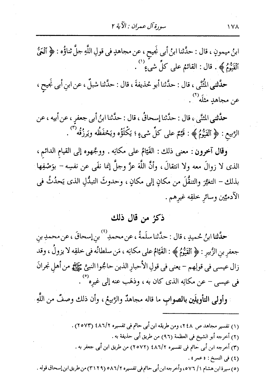 ذِكْرُ مَنْ قَالَ ذَلِكَ: حَدَّثَنِي ابْنُ حُمَيْدٍ، قَالَ: ثنا سَلَمَةُ، عَنْ عُمَرَ بْنِ إِسْحَاقَ، عَنْ مُحَمَّدِ بْنِ جَعْفَرِ بْنِ الزُّبَيْرِ: {§الْقَيُّومُ} [آل عمران: 2] الْقَائِمُ عَلَى مَكَانِهِ مِنْ سُلْطَانِهِ فِي خَلْقِهِ لَا يَزُولُ , وَقَدْ زَالَ عِيسَى فِي قَوْلِهِمْ يَعْنِي فِي قَوْلِ الْأَحْبَارِ الَّذِينَ حَاجُّوا النَّبِيَّ صَلَّى اللهُ عَلَيْهِ وَسَلَّمَ مِنْ أَهْلِ نَجْرَانَ فِي عِيسَى عَنْ مَكَانِهِ الَّذِي كَانَ بِهِ، وَذَهَبَ عَنْهُ إِلَى غَيْرِهِ " وَأَوْلَى التَّأْوِيلَيْنِ بِالصَّوَابِ مَا قَالَهُ مُجَاهِدٌ وَالرَّبِيعُ , وَأَنَّ ذَلِكَ وَصْفٌ مِنَ اللَّهِ