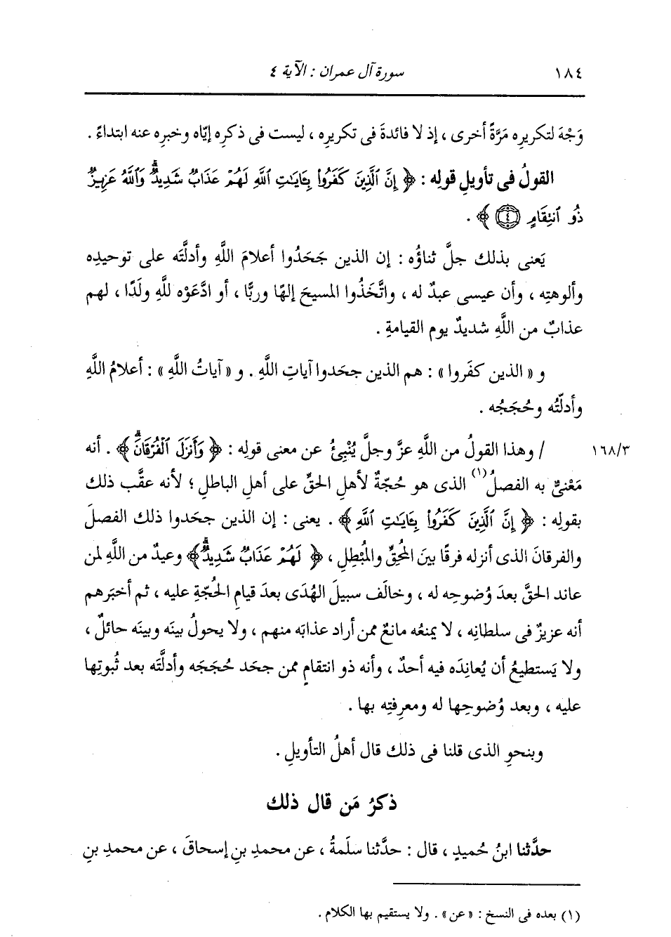 ذِكْرُ مَنْ قَالَ ذَلِكَ: حَدَّثَنَا ابْنُ حُمَيْدٍ، قَالَ: ثنا سَلَمَةُ، عَنْ مُحَمَّدِ بْنِ إِسْحَاقَ، عَنْ مُحَمَّدِ بْنِ -[185]- جَعْفَرِ بْنِ الزُّبَيْرِ: {§إِنَّ الَّذِينَ كَفَرُوا بِآيَاتِ اللَّهِ لَهُمْ عَذَابٌ شَدِيدٌ وَاللَّهُ عَزِيزٌ ذُو انْتِقَامٍ} [آل عمران: 4] «أَيْ أَنَّ اللَّهَ مُنْتَقِمٌ مِمَّنْ كَفَرَ بِآيَاتِهِ بَعْدَ عِلْمِهِ بِهَا، وَمَعْرِفَتِهِ بِمَا جَاءَ مِنْهُ فِيهَا»