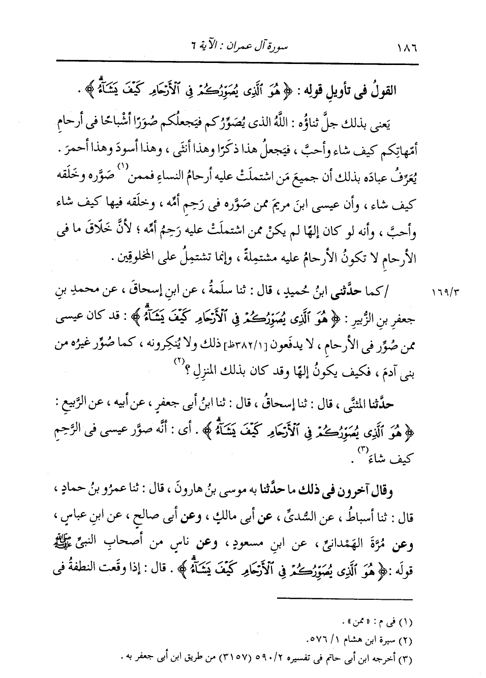 §الْقَوْلُ فِي تَأْوِيلِ قَوْلِهِ تَعَالَى: {هُوَ الَّذِي يُصَوِّرُكُمْ فِي الْأَرْحَامِ كَيْفَ يَشَاءُ لَا إِلَهَ إِلَّا هُوَ الْعَزِيزُ الْحَكِيمُ} [آل عمران: 6] يَعْنِي بِذَلِكَ جَلَّ ثناؤُهُ: اللَّهُ الَّذِي يُصَوِّرُكُمْ فَيَجْعَلَكُمْ صُوَرًا أَشْبَاحًا فِي أَرْحَامِ أُمَّهَاتِكُمْ كَيْفَ شَاءَ وَأَحَبَّ، فَيُجْعَلُ هَذَا ذَكَرًا وَهَذَا أُنْثَى، وَهَذَا أَسْوَدُ وَهَذَا أَحْمَرُ، يُعَرِّفُ عِبَادَهُ بِذَلِكَ أَنَّ جَمِيعَ مَنِ اشْتَمَلَتْ عَلَيْهِ أَرْحَامُ النِّسَاءِ مِمَّنْ صَوَّرَهُ وَخُلُقَهُ كَيْفَ شَاءَ وَأَنَّ عِيسَى ابْنَ مَرْيَمَ مِمَّنْ صُوَّرَهُ فِي رَحِمِ أُمِّهِ وَخَلَقَهُ فِيهَا كَيْفَ شَاءَ وَأَحَبَّ، وَأَنَّهُ لَوْ كَانَ إِلَهًا لَمْ يَكُنْ مِمَّنِ اشْتَمَلَتْ عَلَيْهِ رَحِمُ أُمِّهِ؛ لِأَنَّ خَلَّاقَ مَا فِي الْأَرْحَامِ لَا تَكُونُ الْأَرْحَامُ عَلَيْهِ مُشْتَمِلَةً، وَإِنَّمَا تَشْتَمِلُ عَلَى الْمَخْلُوقِينَ