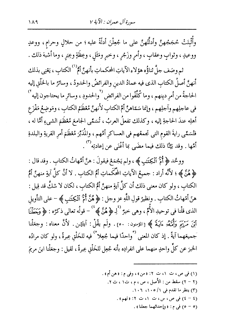 وَأُثْبِتَتْ حُجُجُهُنَّ وَأَدِلَّتِهِنَّ عَلَى مَا جُعْلِنَ أَدِلَّةً عَلَيْهِ مِنْ حَلَالٍ وَحَرَامٍ، وَوَعْدٍ وَوَعِيدٍ، وَثَوَابٍ وَعِقَابٍ، وَأَمْرٍ وَزَجْرٍ، وَخَبَرٍ وَمَثَلٍ، وَعِظَةَ وَعِبَرٍ، وَمَا أَشْبَهَ ذَلِكَ، ثُمَّ وَصَفَ جَلَّ ثناؤُهُ هَؤُلَاءِ الْآيَاتِ الْمُحْكَمَاتِ بِأَنَّهُنَّ هُنَّ أُمُّ الْكِتَابٍ، يَعْنِي بِذَلِكَ أَنَّهُنَّ أَصْلُ الْكِتَابِ الَّذِي فِيهِ عِمَادُ الدِّينِ وَالْفَرَائِضِ وَالْحُدُودِ، وَسَائِرِ مَا بِالْخَلْقِ إِلَيْهِ الْحَاجَةُ مِنْ أَمْرِ دِينِهِمْ، وَمَا كُلِّفُوا مِنَ الْفَرَائِضِ فِي عَاجِلِهِمْ وَآجِلِهِمْ، وَإِنَّمَا سَمَّاهُنَّ أُمَّ الْكِتَابِ، لِأَنَّهُنَّ مُعْظَمُ الْكِتَابِ، وَمَوْضِعُ مَفْزَعِ أَهْلِهِ عِنْدَ الْحَاجَةِ إِلَيْهِ، وَكَذَلِكَ تَفْعَلُ الْعَرَبُ، تُسَمِّي الْجَامِعَ مُعْظَمَ الشَّيْءِ أُمًّا لَهُ، فَتُسَمِّي رَايَةَ الْقَوْمِ الَّتِي تَجْمَعُهُ فِي الْعَسَاكِرِ أُمَّهُمْ، وَالْمُدَبِّرَ مُعْظَمِ أَمْرِ الْقَرْيَةِ وَالْبَلْدَةِ أُمَّهَا، وَقَدْ بَيَّنَّا ذَلِكَ فِيمَا مَضَى بِمَا أَغْنَى عَنْ إِعَادَتِهِ، وَوَحَّدَ أُمَّ الْكِتَابِ، وَلَمْ يَجْمَعْ فَيَقُولُ: هُنَّ أُمَّهَاتُ الْكِتَابِ، وَقَدْ قَالَ هُنَّ؛ لِأَنَّهُ أَرَادَ جَمِيعَ الْآيَاتِ الْمُحْكَمَاتِ أُمَّ الْكِتَابِ، لَا أَنَّ كُلَّ آيَةٍ مِنْهُنَّ أُمُّ الْكِتَابِ، وَلَوْ كَانَ مَعْنَى ذَلِكَ أَنَّ كُلَّ آيَةٍ مِنْهُنَّ أُمُّ الْكِتَابِ، لَكَانَ لَا شَكَّ قَدْ قِيلَ: هُنَّ أُمَّهَاتُ الْكِتَابِ، وَنَظِيرُ قَوْلِ اللَّهِ عَزَّ وَجَلَّ: {هُنَّ أُمُّ الْكِتَابِ} [سورة: آل عمران، آية رقم: 7] عَلَى التَّأْوِيلَ الَّذِي قُلْنَا فِي تَوْحِيدِ الْأُمِّ وَهِيَ خَبَرٌ لِ «هُنَّ» قَوْلُهُ تَعَالَى ذِكْرُهُ: {وَجَعَلْنَا ابْنَ مَرْيَمَ وَأُمَّهُ آيَةً} [سورة: المؤمنون، آية رقم: 50] وَلَمْ يَقُلْ آيَتَيْنِ؛ لِأَنَّ مَعْنَاهُ: وَجَعَلْنَا جَمِيعَهُمَا آيَةً، إِذْ كَانَ الْمَعْنَى وَاحِدًا فِيمَا جَعَلَا فِيهِ لِلْخَلْقِ عِبْرَةً، وَلَوْ كَانَ مُرَادُهُ الْخَبَرَ عَنْ كُلِّ وَاحِدٍ مِنْهُمَا عَلَى انْفِرَادِهِ، بِأَنَّهُ جُعِلَ لِلْخَلْقِ عِبْرَةً، لَقِيلَ: وَجَعَلْنَا ابْنَ مَرْيَمَ