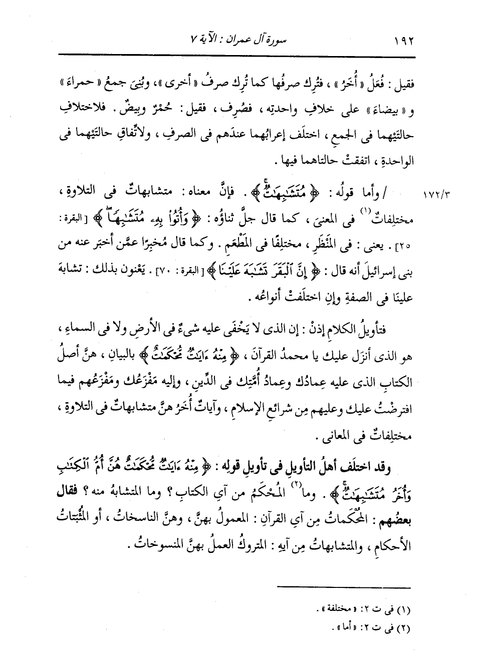 فَقِيلَ: فُعَلُ أُخَرُ، فَتُرِكَ صَرْفُهَا كَمَا تُرِكَ صَرْفُ أُخْرَى، وَبُنِيَ جَمْعُ حَمْرَاءَ وَبَيْضَاءَ عَلَى خِلَافِ وَاحِدَتِهِ، فَصُرِفَ، فَقِيلَ: حُمْرٌ وَبِيضٌ، فَلِاخْتِلَافِ حَالَتَيْهِمَا فِي الْجَمْعِ اخْتَلَفَ إِعْرَابُهُمَا عِنْدَهُمْ فِي الصَّرْفِ، وَلِاتِّفَاقِ حَالَتَيْهِمَا فِي الْوَاحِدَةِ اتَّفَقَتْ حَالَتَاهُمَا فِيهَا. وَأَمَّا قَوْلُهُ: {مُتَشَابِهَاتٌ} [سورة: آل عمران، آية رقم: 7] فَإِنَّ مَعْنَاهُ: مُتَشَابِهَاتٌ فِي التِّلَاوَةِ، مُخْتَلِفَاتٌ فِي الْمَعْنَى، كَمَا قَالَ جَلَّ ثناؤُهُ: {وَأُتُوا بِهِ مُتَشَابِهًا} [سورة: البقرة، آية رقم: 25] يَعْنِي فِي الْمَنْظَرِ مُخْتَلِفًا فِي الْمَطْعَمِ، وَكَمَا قَالَ مُخْبِرًا عَمَّنْ أَخْبَرَ عَنْهُ مِنْ بَنِي إِسْرَائِيلَ أَنَّهُ قَالَ: {إِنَّ الْبَقَرَ تَشَابَهَ عَلَيْنَا} [سورة: البقرة، آية رقم: 70] يَعْنُونَ بِذَلِكَ: تَشَابَهَ عَلَيْنَا فِي الصِّفَةِ وَإِنِ اخْتَلَفَتْ أَنْوَاعُهُ. فَتَأْوِيلُ الْكَلَامِ إِذًا أَنَّ الَّذِي لَا يَخْفَى عَلَيْهِ شَيْءٌ فِي الْأَرْضِ وَلَا فِي السَّمَاءِ، هُوَ الَّذِي أَنْزَلَ عَلَيْكَ يَا مُحَمَّدُ الْقُرْآنَ، مِنْهُ آيَاتٌ مُحْكَمَاتٌ بِالْبَيَانِ، هُنَّ أَصْلُ الْكِتَابِ الَّذِي عَلَيْهِ عِمَادُكَ وَعِمَادُ أُمَّتِكَ فِي الدِّينِ وَإِلَيْهِ مَفْزَعُكَ وَمَفْزَعُهُمْ فِيمَا افْتَرَضْتُ عَلَيْكَ وَعَلَيْهِمْ مِنْ شَرَائِعِ الْإِسْلَامِ، وَآيَاتٍ أُخَرَ هُنَّ مُتَشَابِهَاتٌ فِي التِّلَاوَةِ، مُخْتَلِفَاتٌ فِي الْمَعَانِي. وَقَدِ اخْتَلَفَ أَهْلُ التَّأْوِيلِ فِي تَأْوِيلِ قَوْلِهِ: {مِنْهُ آيَاتٌ مُحْكَمَاتٌ هُنَّ أُمُّ الْكِتَابِ وَأُخَرُ مُتَشَابِهَاتٌ} [سورة: آل عمران، آية رقم: 7] وَمَا الْمُحْكَمُ مِنْ آيِ الْكِتَابِ؟ وَمَا الْمُتَشَابِهُ مِنْهُ؟ فَقَالَ بَعْضُهُمُ: الْمُحْكَمَاتُ مِنْ آيِ الْقُرْآنِ: الْمَعْمُولُ بِهِنَّ، وَهُنَّ النَّاسِخَاتُ، أَوْ الْمُثْبِتَاتُ الْأَحْكَامِ؛ وَالْمُتَشَابِهَاتُ مِنْ آيِهِ الْمَتْرُوكُ الْعَمَلِ بِهِنَّ، الْمَنْسُوخَاتُ