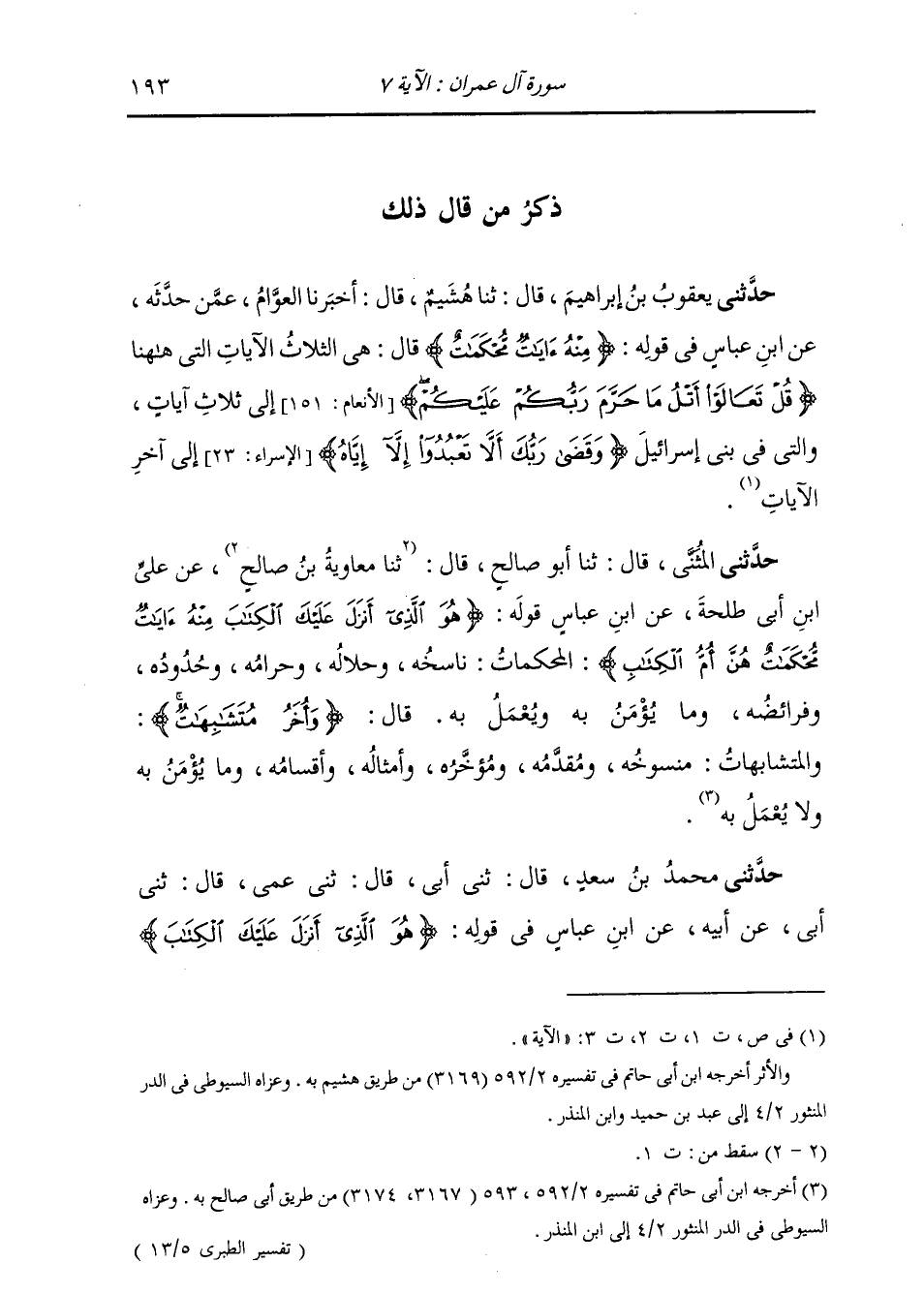 حَدَّثَنِي الْمُثَنَّى، قَالَ: ثنا أَبُو صَالِحٍ، قَالَ: ثنا مُعَاوِيَةُ بْنُ صَالِحٍ، عَنْ عَلِيِّ بْنِ أَبِي طَلْحَةَ، عَنِ ابْنِ عَبَّاسٍ، قَوْلُهُ: {§هُوَ الَّذِي أَنْزَلَ عَلَيْكَ الْكِتَابَ مِنْهُ آيَاتٌ مُحْكَمَاتٌ هُنَّ أُمُّ الْكِتَابِ} [آل عمران: 7] " الْمُحْكَمَاتُ: نَاسِخُهُ، وَحَلَالُهُ، وَحَرَامُهُ، وَحُدُودُهُ، وَفَرَائِضُهُ، وَمَا يُؤْمِنُ بِهِ، وَيَعْمَلُ بِهِ " قَالَ: {وَأُخَرُ مُتَشَابِهَاتٌ} [آل عمران: 7] " وَالْمُتَشَابِهَاتٌ: مَنْسُوخُهُ، وَمُقَدَّمُهُ، وَمُؤَخَّرُهُ، وَأَمْثَالُهُ، وَأَقْسَامُهُ، وَمَا يُؤْمَنُ بِهِ، وَلَا يُعْمَلُ بِهِ "