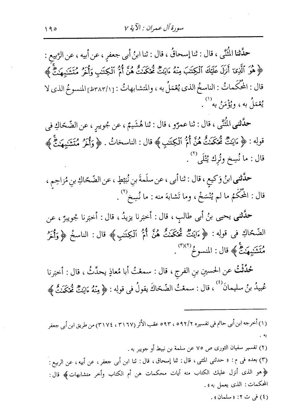 حَدَّثَنِي الْمُثَنَّى، قَالَ: ثنا عَمْرٌو، قَالَ: ثنا هُشَيْمٌ، عَنْ جُوَيْبِرٍ، عَنِ الضَّحَّاكِ، فِي قَوْلِهِ: {§آيَاتٌ مُحْكَمَاتٌ هُنَّ أُمُّ الْكِتَابِ} [آل عمران: 7] قَالَ: «النَّاسِخَاتُ» {وَأُخَرُ مُتَشَابِهَاتٌ} [آل عمران: 7] قَالَ: «مَا نُسِخَ وَتُرِكَ يُتْلَى»