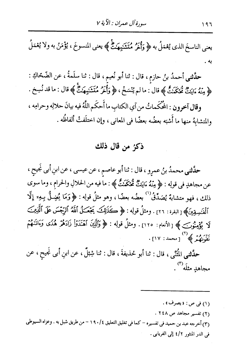 ذِكْرُ مَنْ قَالَ ذَلِكَ: حَدَّثَنِي مُحَمَّدُ بْنُ عَمْرٍو، قَالَ: ثنا أَبُو عَاصِمٍ، عَنْ عِيسَى، عَنِ ابْنِ أَبِي نَجِيحٍ، عَنْ مُجَاهِدٍ، فِي قَوْلِهِ: {§مِنْهُ آيَاتٌ مُحْكَمَاتٌ} [آل عمران: 7] «مَا فِيهِ مِنَ الْحَلَالِ وَالْحَرَامِ وَمَا سِوَى ذَلِكَ، فَهُوَ مُتَشَابِهِ يُصَدِّقُ بَعْضُهُ بَعْضًا» وَهُوَ مِثْلُ قَوْلِهِ: {وَمَا يُضِلُّ بِهِ إِلَّا الْفَاسِقِينَ} [البقرة: 26] وَمَثْلُ قَوْلِهِ: {كَذَلِكَ يَجْعَلُ اللَّهُ الرِّجْسَ عَلَى الَّذِينَ لَا يُؤْمِنُونَ} [الأنعام: 125] وَمَثْلُ قَوْلِهِ: {وَالَّذِينَ اهْتَدَوْا زَادَهُمْ هُدًى وَآتَاهُمْ تَقْوَاهُمْ} [محمد: 17] حَدَّثَنِي الْمُثَنَّى، قَالَ: ثنا أَبُو حُذَيْفَةَ، قَالَ: ثنا شِبْلٌ، عَنِ ابْنِ أَبِي نَجِيحٍ، عَنْ مُجَاهِدٍ، مِثْلَهُ -[197]- وَقَالَ آخَرُونَ: الْمُحْكَمَاتُ مِنْ آيِ الْكِتَابِ: مَا لَمْ يَحْتَمِلْ مِنَ التَّأْوِيلِ غَيْرَ وَجْهٍ وَاحِدٍ؛ وَالْمُتَشَابِهُ مِنْهُ: مَا احْتَمَلَ مِنَ التَّأْوِيلِ أَوْجُهًا