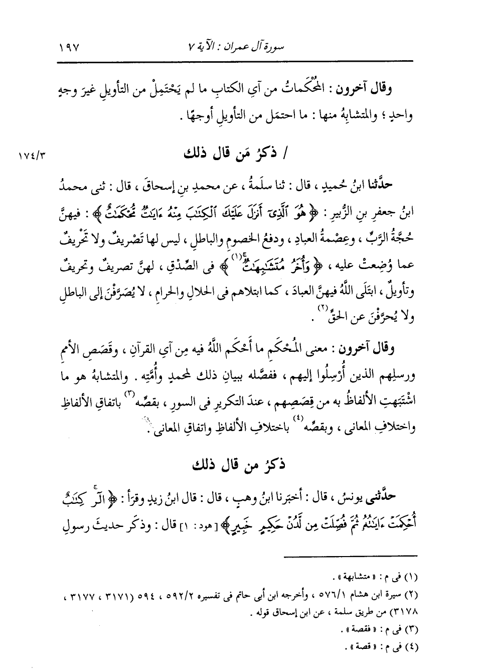 ذِكْرُ مَنْ قَالَ ذَلِكَ: حَدَّثَنَا ابْنُ حُمَيْدٍ، قَالَ: ثنا سَلَمَةُ، عَنْ مُحَمَّدِ بْنِ إِسْحَاقَ، قَالَ: ثني مُحَمَّدُ بْنُ جَعْفَرِ بْنِ الزُّبَيْرِ: {§هُوَ الَّذِي أَنْزَلَ عَلَيْكَ الْكِتَابَ مِنْهُ آيَاتٌ مُحْكَمَاتٌ} [آل عمران: 7] «فِيهِنَّ حُجَّةُ الرَّبِّ وَعِصْمَةُ الْعِبَادِ، وَدَفْعُ الْخُصُومِ وَالْبَاطِلِ، لَيْسَ لَهَا تَصْرِيفٌ وَلَا تَحْرِيفٌ عَمَّا وُضِعَتْ عَلَيْهِ، وَأُخَرُ مُتَشَابِهَةٌ فِي الصِّدْقِ لَهُنَّ تَصْرِيفٌ وَتَحْرِيفٌ وَتَأْوِيلٌ ابْتَلَى اللَّهُ فِيهِنَّ الْعِبَادَ كَمَا ابْتَلَاهُمْ فِي الْحَلَالِ وَالْحَرَامِ، لَا يُصْرَفْنَ إِلَى الْبَاطِلِ وَلَا يُحَرَّفْنَ عَنِ الْحَقِّ» وَقَالَ آخَرُونَ: مَعْنَى الْمُحْكَمِ: مَا أَحْكَمَ اللَّهُ فِيهِ مِنْ آيِ الْقُرْآنِ وَقَصَصِ الْأُمَمِ وَرُسُلِهِمُ الَّذِينَ أُرْسِلُوا إِلَيْهِمْ، فَفَصَّلَهُ بُبَيَانِ ذَلِكَ لِمُحَمَّدٍ وَأُمَّتِهِ، وَالْمُتَشَابِهِ هُوَ مَا اشْتَبَهَتِ الْأَلْفَاظُ بِهِ مِنْ قَصَصِهِمْ عِنْدَ التَّكْرِيرِ فِي السُّوَرِ فَقِصَّةٌ بِاتِّفَاقِ الْأَلْفَاظِ وَاخْتِلَافِ الْمَعَانِي، وَقِصَّةٌ بِاخْتِلَافِ الْأَلْفَاظِ وَاتِّفَاقِ الْمَعَانِي