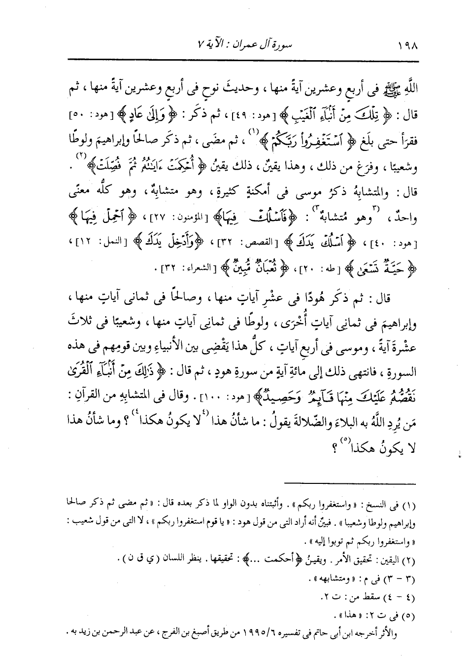 اللَّهِ صَلَّى اللهُ عَلَيْهِ وَسَلَّمَ فِي أَرْبَعٍ وَعِشْرِينَ آيَةً مِنْهَا، وَحَدِيثُ نُوحٍ فِي أَرْبَعٍ وَعِشْرِينَ آيَةً مِنْهَا» . ثُمَّ قَالَ: {تِلْكَ مِنْ أَنْبَاءِ الْغَيْبِ} [هود: 49] ثُمَّ ذَكَرَ: {وَإِلَى عَادٍ} [الأعراف: 65] فَقَرَأَ حَتَّى بَلَغَ: {وَاسْتَغْفِرُوا رَبَّكُمْ} [هود: 90] " ثُمَّ مَضَى، ثُمَّ ذَكَرَ صَالِحًا وَإِبْرَاهِيمَ وَلُوطًا وَشُعَيْبًا، وَفَرَغَ مِنْ ذَلِكَ، وَهَذَا يَقِينٌ، ذَلِكَ يَقِينٌ أُحْكِمَتْ آيَاتُهُ ثُمَّ فُصِّلَتْ، قَالَ: وَالْمُتَشَابِهُ ذِكْرُ مُوسَى فِي أَمْكِنَةٍ كَثِيرَةٍ، وَهُوَ مُتَشَابِهٌ، وَهُوَ كُلُّهُ مَعْنًى وَاحِدٌ وَمُتَشَابِهٌ: {اسْلُكْ فِيهَا} ، {احْمِلْ فِيهَا} [هود: 40] ، {اسْلُكْ يَدَكَ} [القصص: 32] ، {أَدْخِلْ يَدَكَ} [النمل: 12] ، {حَيَّةٌ تَسْعَى} [طه: 20] ، {ثُعْبَانٌ مُبِينٌ} [الأعراف: 107] قَالَ: ثُمَّ ذَكَرَ هُودًا فِي عَشْرٍ آيَاتٍ مِنْهَا، وَصَالِحًا فِي ثَمَانِي آيَاتٍ مِنْهَا وَإِبْرَاهِيمَ فِي ثَمَانِي آيَاتٍ أُخْرَى، وَلُوطًا فِي ثَمَانِي آيَاتٍ مِنْهَا، وَشُعَيْبًا فِي ثَلَاثَ عَشْرَةَ آيَةً، وَمُوسَى فِي أَرْبَعِ آيَاتٍ، كُلُّ هَذَا يَقْضِي بَيْنَ الْأَنْبِيَاءِ وَبَيْنَ قَوْمِهِمْ فِي هَذِهِ السُّورَةِ، فَانْتَهَى ذَلِكَ إِلَى مِائَةِ آيَةٍ مِنْ سُورَةِ هُودٍ، ثُمَّ قَالَ: {ذَلِكَ مِنْ أَنْبَاءِ الْقُرَى نَقُصُّهُ عَلَيْكَ مِنْهَا قَائِمٌ وَحَصِيدٌ} [هود: 100] وَقَالَ فِي الْمُتَشَابِهِ مِنَ الْقُرْآنِ: مَنْ يُرِدِ اللَّهُ بِهِ الْبَلَاءَ وَالضَّلَالَةَ، يَقُولُ: مَا شَأْنُ هَذَا لَا يَكُونُ هَكَذَا؟ وَمَا شَأْنُ هَذَا لَا يَكُونُ هَكَذَا "؟