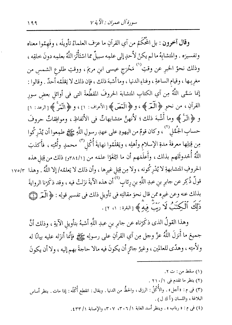 وَقَالَ آخَرُونَ: بَلِ الْمُحْكَمُ مِنْ آيِ الْقُرْآنِ: مَا عَرَفَ الْعُلَمَاءُ تَأْوِيلَهُ، وَفَهِمُوا مَعْنَاهُ وَتَفْسِيرَهُ؛ وَالْمُتَشَابِهُ: مَا لَمْ يَكُنْ لِأَحَدٍ إِلَى عِلْمِهِ سَبِيلٌ مِمَّا اسْتَأْثَرَ اللَّهُ بِعِلْمِهِ دُونَ خَلْقِهِ، وَذَلِكَ نَحْوُ الْخَبَرِ عَنْ وَقْتِ مَخْرَجِ عِيسَى ابْنِ مَرْيَمَ، وَوَقْتِ طُلُوعِ الشَّمْسِ مِنْ مَغْرِبِهَا، وَقِيَامِ السَّاعَةِ، وَفَنَاءِ الدُّنْيَا، وَمَا أَشْبَهَ ذَلِكَ، فَإِنَّ ذَلِكَ لَا يَعْلَمُهُ أَحَدٌ، وَقَالُوا: إِنَّمَا سَمَّى اللَّهُ مِنْ آيِ الْكِتَابِ الْمُتَشَابِهِ الْحُرُوفِ الْمُقَطَّعَةَ الَّتِي فِي أَوَائِلِ بَعْضِ سُوَرِ الْقِرَانِ مِنْ نَحْوِ «الم، وَالمص، وَالمر، وَالر» ، وَمَا أَشْبَهَ ذَلِكَ؛ لِأَنَّهُنَّ مُتَشَابِهَاتٌ فِي الْأَلْفَاظِ، وَمُوَافِقَاتٌ حُرُوفَ حِسَابِ الْجُمَّلِ، وَكَانَ قَوْمٌ مِنَ الْيَهُودِ عَلَى عَهْدِ رَسُولِ اللَّهِ صَلَّى اللهُ عَلَيْهِ وَسَلَّمَ طَمِعُوا أَنْ يُدْرِكُوا مِنْ قِبَلِهَا مَعْرِفَةَ مُدَّةِ الْإِسْلَامِ وَأَهْلِهِ، وَيَعْلَمُوا نِهَايَةَ أُكُلِ مُحَمَّدٍ وَأُمَّتِهِ، فَأَكْذَبَ اللَّهُ أُحْدُوثَتَهُمْ بِذَلِكَ، وَأَعْلَمُهُمْ أَنَّ مَا ابْتَغَوْا عِلْمَهُ مِنْ ذَلِكَ مِنْ قِبَلِ هَذِهِ الْحُرُوفِ الْمُتَشَابِهَةِ لَا يُدْرِكُونَهُ وَلَا مِنْ قِبَلِ غَيْرِهَا، وَأَنَّ ذَلِكَ لَا يَعْلَمُهُ إِلَّا اللَّهُ، وَهَذَا قَوْلٌ ذُكِرَ عَنْ جَابِرِ بْنِ عَبْدِ اللَّهِ بْنِ رِئَابٍ أَنَّ هَذِهِ الْآيَةَ نَزَلَتْ فِيهِ، وَقَدْ ذَكَرْنَا الرِّوَايَةَ بِذَلِكَ عَنْهُ وَعَنْ غَيْرِهِ مِمَّنْ قَالَ نَحْوَ مَقَالَتِهِ فِي تَأْوِيلِ ذَلِكَ فِي تَفْسِيرِ قَوْلِهِ: {الم ذَلِكَ الْكِتَابُ لَا رَيْبَ فِيهِ} [البقرة: 2] وَهَذَا الْقَوْلُ الَّذِي ذَكَرْنَاهُ عَنْ جَابِرِ بْنِ عَبْدِ اللَّهِ أَشْبَهُ بِتَأْوِيلِ الْآيَةِ، وَذَلِكَ أَنَّ جَمِيعَ مَا أَنْزَلَ اللَّهُ عَزَّ وَجَلَّ مِنْ آيِ الْقُرْآنِ عَلَى رَسُولِ اللَّهِ صَلَّى اللهُ عَلَيْهِ وَسَلَّمَ، فَإِنَّمَا أَنْزَلَهُ عَلَيْهِ بَيَانًا لَهُ وَلِأُمَّتِهِ وَهُدًى لِلْعَالَمِينَ، وَغَيْرُ جَائِزٍ أَنْ يَكُونَ فِيهِ مَا لَا حَاجَةَ بِهِمْ إِلَيْهِ، وَلَا أَنْ يَكُونَ