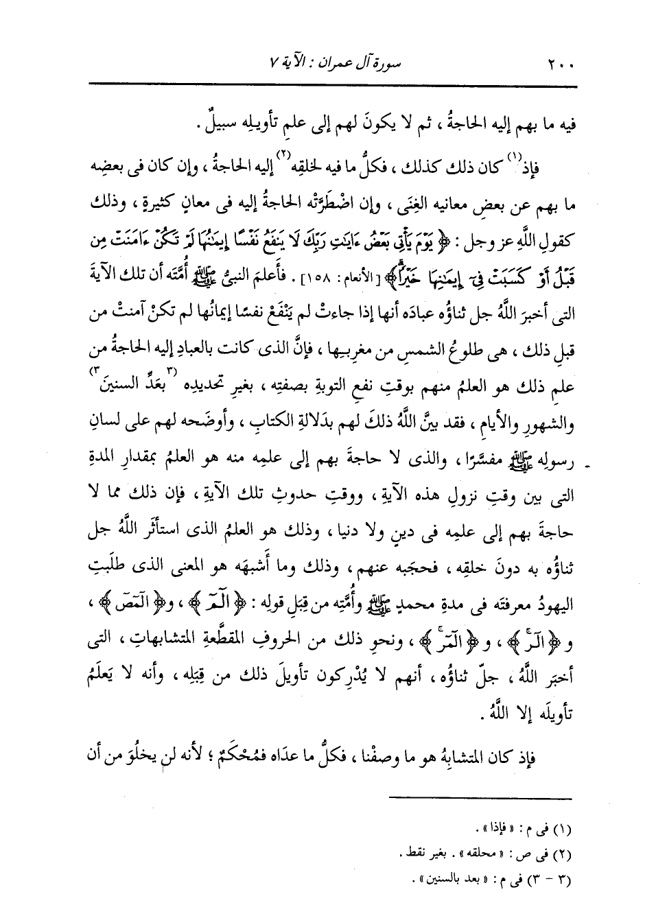 فِيهِ مَا بِهِمْ إِلَيْهِ الْحَاجَةُ، ثُمَّ لَا يَكُونُ لَهُمْ إِلَى عِلْمِ تَأْوِيلِهِ سَبِيلٌ، فَإِذَا كَانَ ذَلِكَ كَذَلِكَ، فَكُلُّ مَا فِيهِ لِخَلْقِهِ إِلَيْهِ الْحَاجَةُ وَإِنْ كَانَ فِي بَعْضِهِ مَا بِهِمْ عَنْ بَعْضِ مَعَانِيهِ الْغِنَى، وَإِنِ اضْطَرَّتْهُ الْحَاجَةُ إِلَيْهِ فِي مَعَانٍ كَثِيرَةٍ، وَذَلِكَ كَقَوْلِ اللَّهِ عَزَّ وَجَلَّ: {يَوْمَ يَأْتِي بَعْضُ آيَاتِ رَبِّكَ لَا يَنْفَعُ نَفْسًا إِيمَانُهَا لَمْ تَكُنْ آمَنَتْ مِنْ قَبْلُ أَوْ كَسَبَتْ فِي إِيمَانِهَا خَيْرًا} [الأنعام: 158] فَأَعْلَمَ النَّبِيَّ صَلَّى اللهُ عَلَيْهِ وَسَلَّمَ أُمَّتَهُ أَنَّ تِلْكَ الْآيَةَ الَّتِي أَخْبَرَ اللَّهُ جَلَّ ثناؤُهُ عِبَادَهُ أَنَّهَا إِذَا جَاءَتْ لَمْ يَنْفَعْ نَفْسًا إِيمَانُهَا لَمْ تَكُنْ آمَنَتْ مِنْ قَبْلِ ذَلِكَ، هِيَ طُلُوعُ الشَّمْسِ مِنْ مَغْرِبِهَا، فَالَّذِي كَانَتْ بِالْعِبَادِ إِلَيْهِ الْحَاجَةُ مِنْ عِلْمِ ذَلِكَ هُوَ الْعِلْمُ مِنْهُمْ بِوَقْتِ نَفْعِ التَّوْبَةِ بِصِفَتِهِ بِغَيْرِ تَحْدِيدِهِ بَعَدٍّ بِالسِّنِينَ وَالشُّهُورِ وَالْأَيَّامِ، فَقَدْ بَيَّنَ اللَّهُ ذَلِكَ لَهُمْ بِدَلَالَةِ الْكِتَابِ، وَأَوْضَحَهُ لَهُمْ عَلَى لِسَانِ رَسُولِ صَلَّى اللهُ عَلَيْهِ وَسَلَّمَ مُفَسَّرًا، وَالَّذِي لَا حَاجَةَ لَهُمْ إِلَى عِلْمِهِ مِنْهُ هُوَ الْعِلْمُ بِمِقْدَارِ الْمُدَّةِ الَّتِي بَيْنَ وَقْتِ نُزُولِ هَذِهِ الْآيَةِ وَوَقْتِ حُدُوثِ تِلْكَ الْآيَةِ، فَإِنَّ ذَلِكَ مِمَّا لَا حَاجَةَ بِهِمْ إِلَى عِلْمِهِ فِي دِينٍ وَلَا دُنْيَا، وَذَلِكَ هُوَ الْعِلْمُ الَّذِي اسْتَأْثَرَ اللَّهُ جَلَّ ثناؤُهُ بِهِ دُونَ خَلْقِهِ، فَحَجَبَهُ عَنْهُمْ، وَذَلِكَ وَمَا أَشْبَهَهُ هُوَ الْمَعْنَى الَّذِي طَلَبَتِ الْيَهُودُ مَعْرِفَتَهُ فِي مُدَّةِ مُحَمَّدٍ صَلَّى اللهُ عَلَيْهِ وَسَلَّمَ وَأُمَّتِهِ مِنْ قِبَلِ قَوْلِهِ: «الم، وَالمص، وَالر، وَالمر» وَنَحْوِ ذَلِكَ مِنَ الْحُرُوفِ الْمُقَطَّعَةِ الْمُتَشَابِهَاتِ الَّتِي أَخْبَرَ اللَّهُ جَلَّ ثناؤُهُ أَنَّهُمْ لَا يُدْرِكُونَ تَأْوِيلَ ذَلِكَ مِنْ قِبَلِهِ، وَأَنَّهُ لَا يَعْلَمُ تَأْوِيلَهُ إِلَّا اللَّهُ. فَإِذَا كَانَ الْمُتَشَابِهُ هُوَ مَا وَصَفْنَا، فَكُلُّ مَا عَدَاهُ فَمُحْكَمٌ؛ لِأَنَّهُ لَنْ يَخْلُوَ مِنْ أَنْ