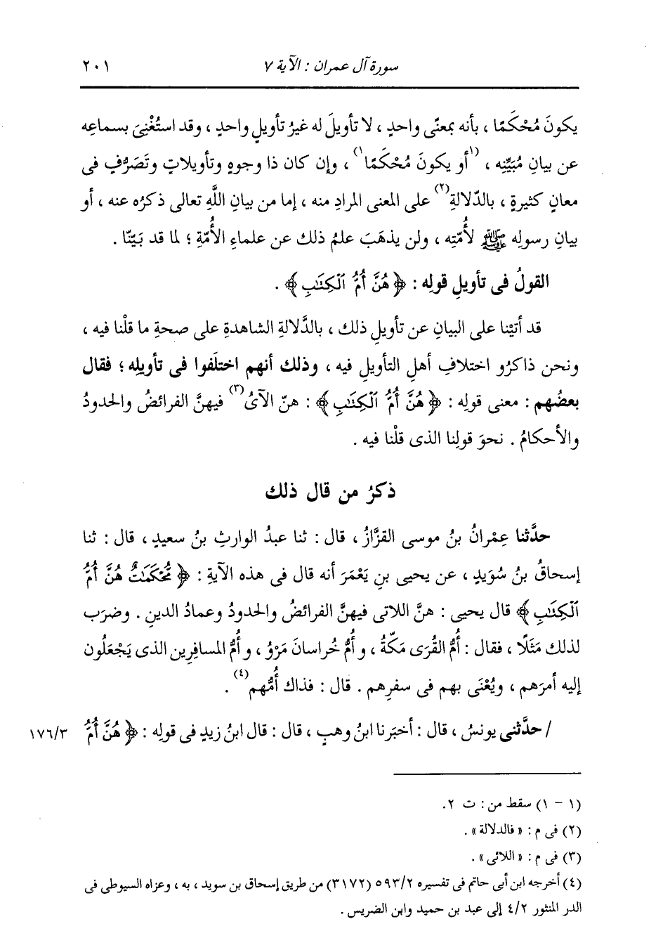 ذِكْرُ مَنْ قَالَ ذَلِكَ: حَدَّثَنَا عِمْرَانُ بْنُ مُوسَى الْقَزَّازُ، قَالَ: ثنا عَبْدُ الْوَارِثِ بْنُ سَعِيدٍ، قَالَ: ثنا إِسْحَاقُ بْنُ سُوَيْدٍ، عَنْ يَحْيَى بْنِ يَعْمُرَ، أَنَّهُ قَالَ فِي هَذِهِ الْآيَةِ: " {§مُحْكَمَاتٌ هُنَّ أُمُّ الْكِتَابِ} [آل عمران: 7] قَالَ يَحْيَى: " هُنَّ اللَّاتِي فِيهِنَّ الْفَرَائِضُ وَالْحُدُودُ وَعِمَادُ الدِّينِ، وَضَرَبَ لِذَلِكَ مَثَلًا فَقَالَ: أُمُّ الْقُرَى مَكَّةُ، وَأُمُّ خُرَاسَانَ مَرْوُ، وَأُمُّ الْمُسَافِرِينَ الَّذِينَ يَجْعَلُونَ إِلَيْهِ أَمَرَهُمْ، وَيُعْنَى بِهِمْ فِي سَفَرِهِمْ، قَالَ: فَذَاكَ أُمُّهُمْ "