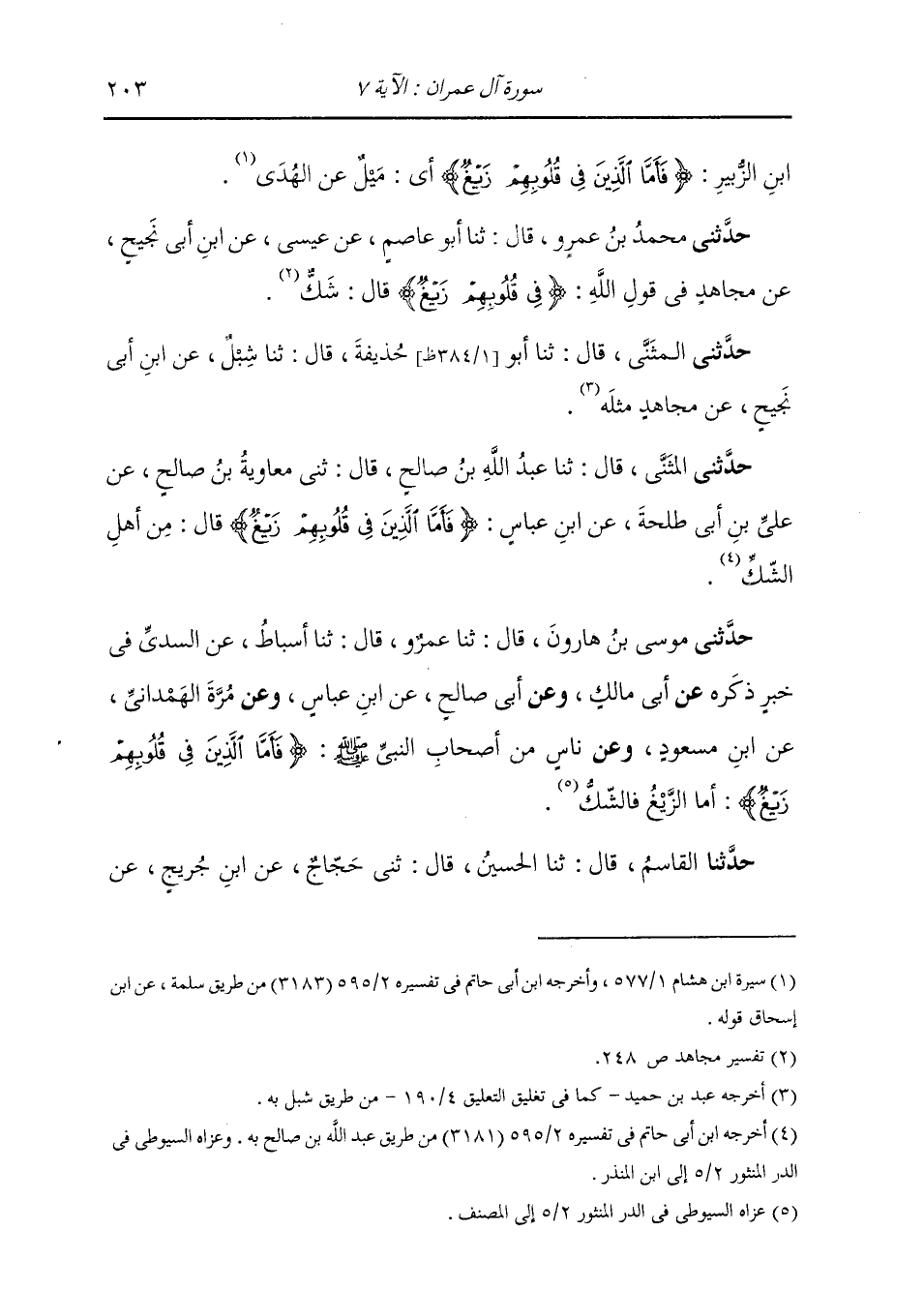 حَدَّثَنِي الْمُثَنَّى، قَالَ: ثنا عَبْدُ اللَّهِ بْنُ صَالِحٍ، قَالَ: ثني مُعَاوِيَةُ بْنُ صَالِحٍ، عَنْ عَلِيِّ بْنِ أَبِي طَلْحَةَ، عَنِ ابْنِ عَبَّاسٍ: {§فَأَمَّا الَّذِينَ فِي قُلُوبِهِمْ زَيْغٌ} [آل عمران: 7] قَالَ: «مِنْ أَهْلِ الشَّكِّ»