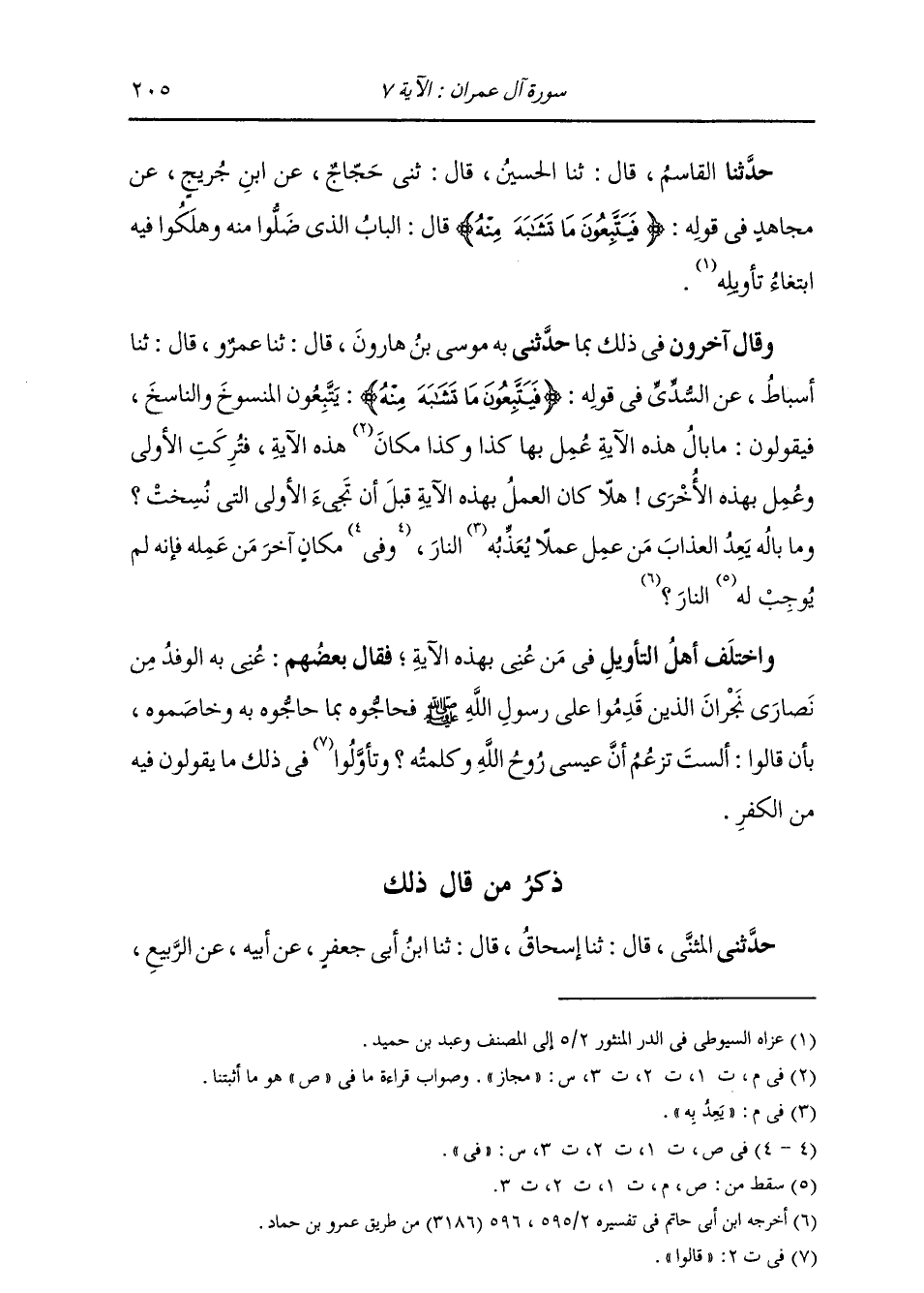 وَقَالَ آخَرُونَ فِي ذَلِكَ بِمَا: حَدَّثَنِي بِهِ مُوسَى بْنُ هَارُونَ، قَالَ: ثنا عَمْرٌو، قَالَ: ثنا أَسْبَاطٌ، عَنِ السُّدِّيِّ، فِي قَوْلِهِ: {§فَيَتَّبِعُونَ مَا تَشَابَهَ مِنْهُ} [آل عمران: 7] " يَتَّبِعُونَ الْمَنْسُوخَ وَالنَّاسِخَ، فَيَقُولُونَ: مَا بَالُ هَذِهِ الْآيَةِ عُمِلَ بِهَا كَذَا وَكَذَا، مَجَازُ هَذِهِ الْآيَةِ، فَتُرِكَتِ الْأُولَى وَعُمِلَ بِهَذِهِ الْأُخْرَى؟ هَلَّا كَانَ الْعَمَلُ بِهَذِهِ الْآيَةِ قَبْلَ أَنْ تَجِيءَ الْأُولَى الَّتِي نُسِخَتْ، وَمَا بَالُهُ يَعِدُ الْعَذَابَ مَنْ عَمِلَ عَمَلًا يَعِدُ بِهِ النَّارَ وَفِي مَكَانٍ آخَرَ مِنْ عَمَلِهِ فَإِنَّهُ لَمْ يُوجِبِ النَّارَ؟ " وَاخْتَلَفَ أَهْلُ التَّأْوِيلِ فِيمَنْ عُنِيَ بِهَذِهِ الْآيَةِ، فَقَالَ بَعْضُهُمْ: عُنِيَ بِهِ الْوَفْدُ مِنْ نَصَارَى نَجْرَانَ الَّذِينَ قَدِمُوا عَلَى رَسُولِ اللَّهِ صَلَّى اللهُ عَلَيْهِ وَسَلَّمَ، فَحَاجُّوهُ بِمَا حَاجُّوهُ بِهِ، وَخَاصَمُوهُ بِأَنْ قَالُوا: أَلَسْتَ تَزْعُمُ أَنَّ عِيسَى رُوحُ اللَّهِ وَكَلِمَتُهُ؟ وَتَأَوَّلُوا فِي ذَلِكَ مَا يَقُولُونَ فِيهِ مِنَ الْكُفْرِ
