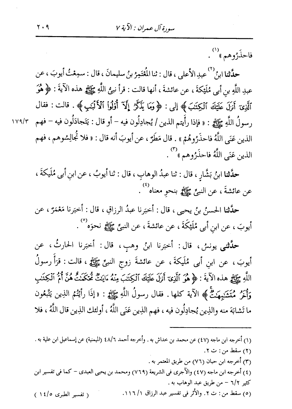 حَدَّثَنَا ابْنُ عَبْدِ الْأَعْلَى، قَالَ: ثنا الْمُعْتَمِرُ بْنُ سُلَيْمَانَ، قَالَ: سَمِعْتُ أَيُّوبَ، عَنْ عَبْدِ اللَّهِ بْنِ أَبِي مُلَيْكَةَ، عَنْ عَائِشَةَ أَنَّهَا قَالَتْ: قَرَأَ نَبِيُّ اللَّهِ صَلَّى اللهُ عَلَيْهِ وَسَلَّمَ هَذِهِ الْآيَةَ: {§هُوَ الَّذِي أَنْزَلَ عَلَيْكَ الْكِتَابَ} [آل عمران: 7] إِلَى: {وَمَا يَذَّكَّرُ إِلَّا أُولُو الْأَلْبَابِ} قَالَتْ: فَقَالَ رَسُولُ اللَّهِ صَلَّى اللهُ عَلَيْهِ وَسَلَّمَ: «فَإِذَا رَأَيْتُمُ الَّذِينَ يُجَادِلُونَ فِيهِ» أَوْ قَالَ: «وَيَتَجَادَلُونَ فِيهِ فَهُمُ الَّذِينَ عَنَى اللَّهُ فَاحْذَرُوهُمْ» قَالَ مَطَرٌ: عَنْ أَيُّوبَ أَنَّهُ قَالَ: «فَلَا تُجَالِسُوهُمْ؛ فَهُمُ الَّذِينَ عَنَى اللَّهُ فَاحْذَرُوهُمْ» حَدَّثَنَا ابْنُ بَشَّارٍ، قَالَ: ثنا عَبْدُ الْوَهَّابِ، قَالَ: ثنا أَيُّوبُ، عَنِ ابْنِ أَبِي مُلَيْكَةَ، عَنْ عَائِشَةَ، عَنِ النَّبِيِّ صَلَّى اللهُ عَلَيْهِ وَسَلَّمَ، بِنَحْوِ مَعْنَاهُ. حَدَّثَنَا الْحَسَنُ بْنُ يَحْيَى، قَالَ: أَخْبَرَنَا عَبْدُ الرَّزَّاقِ، قَالَ: أَخْبَرَنَا مَعْمَرٌ، عَنْ أَيُّوبَ، عَنِ ابْنِ أَبِي مُلَيْكَةَ، عَنْ عَائِشَةَ، عَنِ النَّبِيِّ صَلَّى اللهُ عَلَيْهِ وَسَلَّمَ، نَحْوَهُ