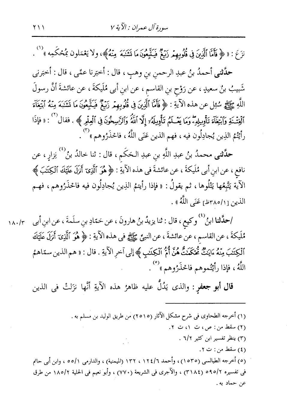 حَدَّثَنَا ابْنُ وَكِيعٍ، قَالَ: ثنا يَزِيدُ بْنُ هَارُونَ، عَنْ حَمَّادِ بْنِ سَلَمَةَ، عَنِ ابْنِ أَبِي مُلَيْكَةَ، عَنِ الْقَاسِمِ، عَنْ عَائِشَةَ، عَنِ النَّبِيِّ صَلَّى اللهُ عَلَيْهِ وَسَلَّمَ فِي هَذِهِ الْآيَةِ: {§هُوَ الَّذِي أَنْزَلَ عَلَيْكَ الْكِتَابَ مِنْهُ آيَاتٌ مُحْكَمَاتٌ هُنَّ أُمُّ الْكِتَابِ} [آل عمران: 7] إِلَى آخِرِ الْآيَةِ، قَالَ: «هُمُ الَّذِينَ سَمَّاهُمُ اللَّهُ، فَإِذَا رَأَيْتُمُوهُمْ فَاحْذَرُوهُمْ» قَالَ أَبُو جَعْفَرٍ: وَالَّذِي يَدُلُّ عَلَيْهِ ظَاهِرُ هَذِهِ الْآيَةِ أَنَّهَا نَزَلَتْ فِي الَّذِينَ -[212]- جَادَلُوا رَسُولَ اللَّهِ صَلَّى اللهُ عَلَيْهِ وَسَلَّمَ بِمُتَشَابِهِ مَا أُنْزِلَ إِلَيْهِ مِنْ كِتَابِ اللَّهِ إِمَّا فِي أَمْرِ عِيسَى، وَإِمَّا فِي مُدَّةِ أكُلُهِ وَأُكُلِ أُمَّتِهِ، وَهُوَ بِأَنْ تَكُونَ فِي الَّذِينَ جَادَلُوا رَسُولَ اللَّهِ صَلَّى اللهُ عَلَيْهِ وَسَلَّمَ بِمُتَشَابِهِهِ فِي مُدَّتِهِ وَمُدِّهِ أُمَّتِهِ أَشْبَهُ؛ لِأَنَّ قَوْلَهُ: {وَمَا يَعْلَمُ تَأْوِيلَهُ إِلَّا اللَّهُ} [آل عمران: 7] دَالٌ عَلَى أَنَّ ذَلِكَ إِخْبَارٌ عَنِ الْمُدَّةِ الَّتِي أَرَادُوا عِلْمَهَا مِنْ قِبَلِ الْمُتَشَابِهِ الَّذِي لَا يَعْلَمُهُ إِلَّا اللَّهُ، فَأَمَّا أَمْرُ عِيسَى وَأَسْبَابُهُ، فَقَدْ أَعْلَمَ اللَّهُ ذَلِكَ نَبِيَّهُ مُحَمَّدًا صَلَّى اللهُ عَلَيْهِ وَسَلَّمَ وَأُمَّتَهُ وَبَيَّنَهُ لَهُمْ، فَمَعْلُومٌ أَنَّهُ لَمْ يَعْنِ إِلَّا مَا كَانَ خَفِيًّا عَنِ الْآحَادِ