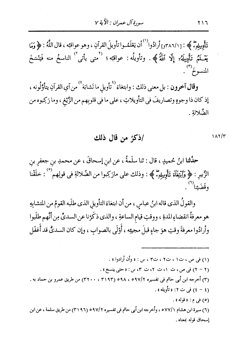 ذِكْرُ مَنْ قَالَ ذَلِكَ: حَدَّثَنَا ابْنُ حُمَيْدٍ، قَالَ: ثنا سَلَمَةُ، عَنِ ابْنِ إِسْحَاقَ، عَنْ مُحَمَّدِ بْنِ جَعْفَرِ بْنِ الزُّبَيْرِ: {§وَابْتِغَاءَ تَأْوِيلِهِ} [آل عمران: 7] " وَذَلِكَ عَلَى مَا رَكِبُوا مِنَ الضَّلَالَةِ فِي قَوْلِهِمْ: خَلَقْنَا وَقَضَيْنَا " وَالْقَوْلُ الَّذِي قَالَهُ ابْنِ عَبَّاسٍ مِنْ أَنَّ ابْتِغَاءَ التَّأْوِيلِ الَّذِي طَلَبَهُ الْقَوْمُ مِنَ الْمُتَشَابِهِ هُوَ مَعْرِفَةُ انْقِضَاءِ الْمُدَّةِ، وَوَقْتِ قِيَامِ السَّاعَةِ، وَالَّذِي ذَكَرْنَا عَنِ السُّدِّيِّ مِنْ أَنَّهُمْ طَلَبُوا وَأَرَادُوا مَعْرِفَةَ وَقْتٍ هُوَ جَاءَ قَبْلَ مَجِيئِهِ أَوْلَى بِالصَّوَابِ، وَإِنْ كَانَ السُّدِّيُّ قَدْ أَغْفَلَ