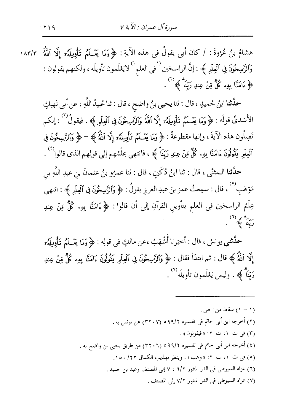 حَدَّثَنَا ابْنُ حُمَيْدٍ، قَالَ: ثنا يَحْيَى بْنُ وَاضِحٍ، قَالَ: ثنا عُبَيْدُ اللَّهِ، عَنْ أَبِي نَهِيكٍ الْأَسَدِيِّ، قَوْلُهُ: {§وَمَا يَعْلَمُ تَأْوِيلَهُ إِلَّا اللَّهُ وَالرَّاسِخُونَ فِي الْعِلْمِ} [آل عمران: 7] فَيَقُولُ: «إِنَّكُمْ تَصِلُونَ هَذِهِ الْآيَةَ وَإِنَّهَا مَقْطُوعَةٌ» {وَمَا يَعْلَمُ تَأْوِيلَهُ إِلَّا اللَّهُ وَالرَّاسِخُونَ فِي الْعِلْمِ يَقُولُونَ آمَنَّا بِهِ كُلٌّ مِنْ عِنْدِ رَبِّنَا} [آل عمران: 7] «فَانْتَهَى عِلْمُهُمْ إِلَى قَوْلِهِمُ الَّذِي قَالُوا»