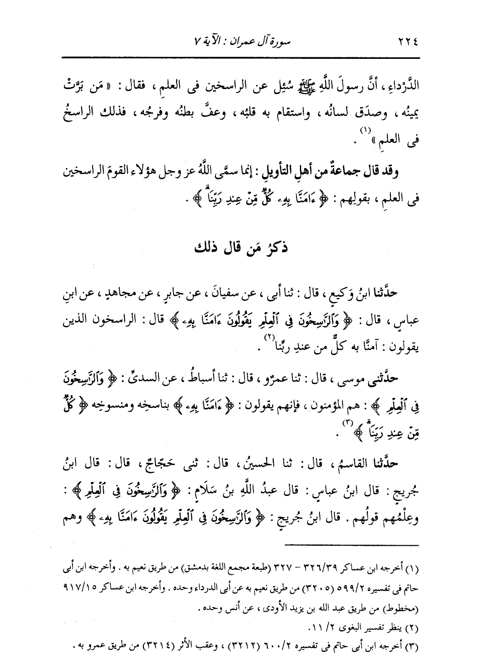 حَدَّثَنَا الْقَاسِمُ، قَالَ: ثنا الْحُسَيْنُ، قَالَ: ثني حَجَّاجٌ، قَالَ: قَالَ ابْنُ جُرَيْجٍ: قَالَ ابْنُ عَبَّاسٍ: قَالَ عَبْدُ اللَّهِ بْنُ سَلَامٍ: {§الرَّاسِخُونَ فِي الْعِلْمِ} [آل عمران: 7] «وَعِلْمُهُمْ قَوْلُهُمْ» قَالَ ابْنُ جُرَيْجٍ: {الرَّاسِخُونَ فِي الْعِلْمِ يَقُولُونَ آمَنَّا بِهِ} [آل عمران: 7] وَهُمُ -[225]- الَّذِينَ يَقُولُونَ: {رَبَّنَا لَا تُزِغْ قُلُوبَنَا} [آل عمران: 8] وَيَقُولُونَ: {رَبَّنَا إِنَّكَ جَامِعُ النَّاسِ لِيَوْمٍ لَا رَيْبَ فِيهِ} [آل عمران: 9] الْآيَةَ وَأَمَّا تَأْوِيلُ قَوْلِهِ: {يَقُولُونَ آمَنَّا بِهِ} [آل عمران: 7] فَإِنَّهُ يَعْنِي: أَنَّ الرَّاسِخِينَ فِي الْعِلْمِ يَقُولُونَ صَدَّقْنَا بِمَا تَشَابَهَ مِنْ آيِ الْكِتَابِ وَأَنَّهُ حَقٌّ وَإِنْ لَمْ نَعْلَمْ تَأْوِيلَهُ