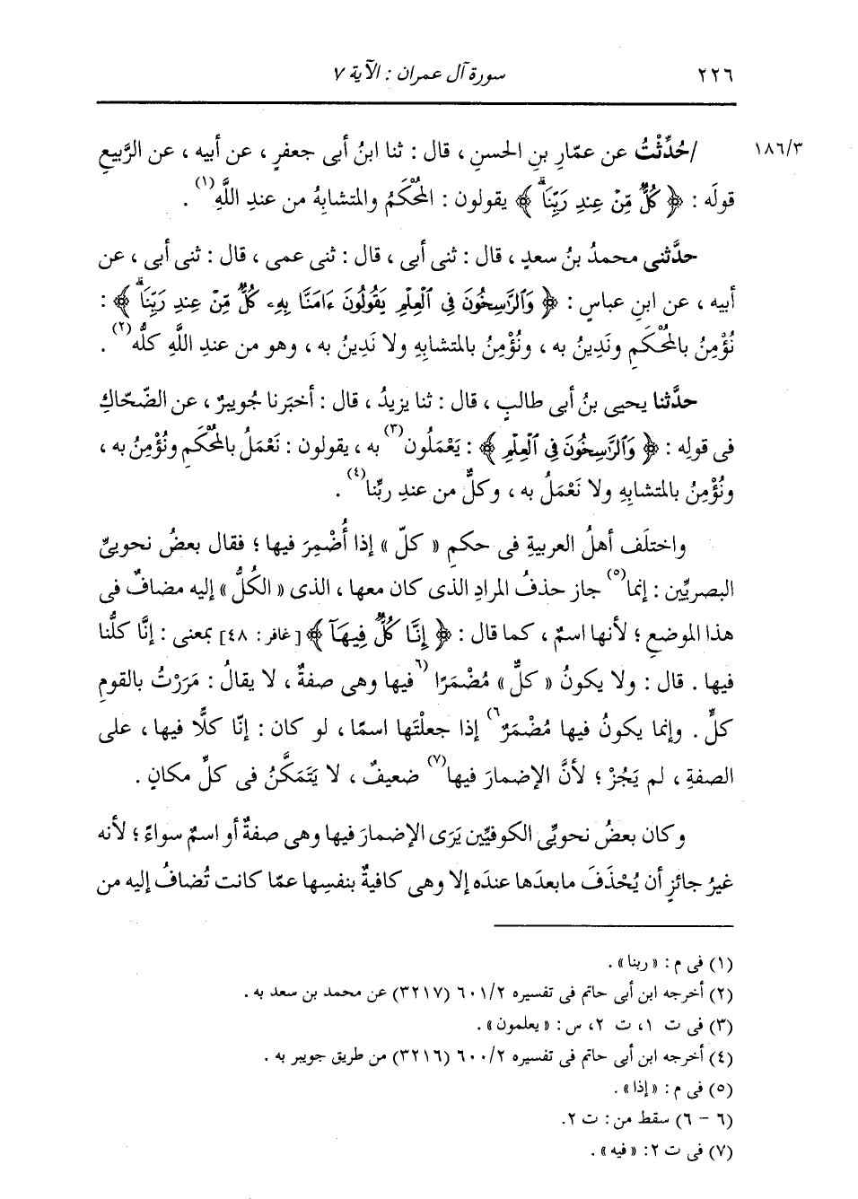 حَدَّثَنِي مُحَمَّدُ بْنُ سَعْدٍ، قَالَ: ثني أَبِي، قَالَ: ثني عَمِّي، قَالَ: ثني أَبِي، عَنْ أَبِيهِ، عَنِ ابْنِ عَبَّاسٍ: §وَالرَّاسِخُونَ فِي الْعِلْمِ يَقُولُونَ آمَنَّا بِهِ كُلٌّ مِنْ عِنْدِ رَبِّنَا «يُؤْمِنُ بِالْمُحْكَمِ وَيَدِينُ بِهِ، وَيُؤْمِنُ بِالْمُتَشَابِهِ وَلَا يَدِينُ بِهِ، وَهُوَ مِنْ عِنْدِ اللَّهِ كُلُّهُ»