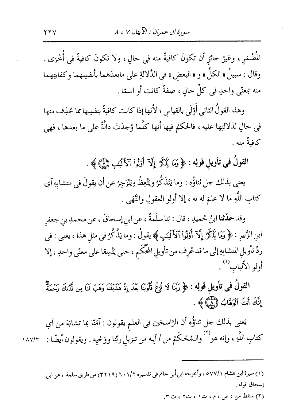 وَقَدْ: حَدَّثَنَا ابْنُ حُمَيْدٍ، قَالَ: ثنا سَلَمَةُ، عَنِ ابْنِ إِسْحَاقَ، عَنْ مُحَمَّدِ بْنِ جَعْفَرِ بْنِ الزُّبَيْرِ: {§وَمَا يَذَّكَّرُ إِلَّا أُولُو الْأَلْبَابِ} يَقُولُ: «وَمَا يَذَكَّرُ فِي مِثْلِ هَذَا، يَعْنِي فِي رَدِّ تَأْوِيلِ الْمُتَشَابِهِ إِلَى مَا قَدْ عَرَفَ مِنْ تَأْوِيلِ الْمُحْكَمِ حَتَّى يَتَّسِقَا عَلَى مَعْنًى وَاحِدٍ، إِلَّا أُولُو الْأَلْبَابِ»