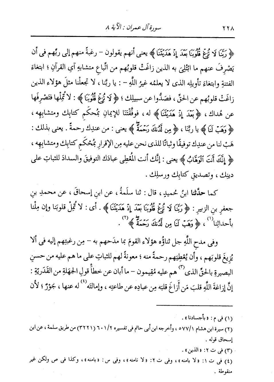 كَمَا: حَدَّثَنَا ابْنُ حُمَيْدٍ، قَالَ: ثنا سَلَمَةُ، عَنِ ابْنِ إِسْحَاقَ، عَنْ مُحَمَّدِ بْنِ جَعْفَرِ بْنِ الزُّبَيْرِ: {§رَبَّنَا لَا تُزِغْ قُلُوبَنَا بَعْدَ إِذْ هَدَيْتَنَا} [آل عمران: 8] " أَيْ لَا تُمِلْ قُلُوبَنَا وَإِنْ مِلْنَا بِأَحْدَاثِنَا، {وَهَبْ لَنَا مِنْ لَدُنْكَ رَحْمَةً} [آل عمران: 8] " وَفِي مَدْحِ اللَّهِ جَلَّ ثناؤُهُ هَؤُلَاءِ الْقَوْمَ بِمَا مَدَحَهُمْ بِهِ مِنْ رَغْبَتِهِمْ إِلَيْهِ فِي أَنْ لَا يُزِيغَ قُلُوبَهُمْ، وَأَنْ يُعْطِيَهُمْ رَحْمَةً مِنْهُ، مَعُونَةٌ لَهُمْ لِلثَّبَاتِ عَلَى مَا هُمْ عَلَيْهِ مِنْ حُسْنِ الْبَصِيرَةِ بِالْحَقِّ الَّذِي هُمْ عَلَيْهِ مُقِيمُونَ، مَا أَبَانَ عَنْ خَطَأِ قَوْلِ الْجَهَلَةِ مِنَ الْقَدَرِيَّةِ أَنَّ إِزَاغَةَ اللَّهِ قَلْبَ مَنْ أَزَاغَ قَلْبَهُ مِنْ عِبَادِهِ عَنْ طَاعَتِهِ، وَإِمَالَتَهُ لَهُ عَنْهَا جَوْرٌ؛ لِأَنَّ