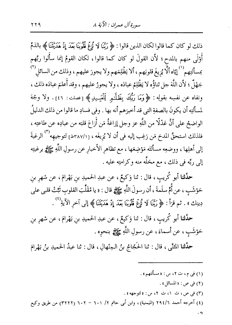 ذَلِكَ لَوْ كَانَ كَمَا قَالُوا لَكَانَ الَّذِينَ قَالُوا: {رَبَّنَا لَا تُزِغْ قُلُوبَنَا بَعْدَ إِذْ هَدَيْتَنَا} [آل عمران: 8] بِالذَّمِّ أَوْلَى مِنْهُمْ بِالْمَدْحِ؛ لِأَنَّ الْقَوْلَ لَوْ كَانَ كَمَا قَالُوا، لَكَانَ الْقَوْمُ إِنَّمَا سَأَلُوا رَبَّهُمْ مَسْأَلَتَهُمْ إِيَّاهُ أَنْ لَا يَزِيغَ قُلُوبَهُمْ أَنْ لَا يَظْلِمَهُمْ وَلَا يَجُورَ عَلَيْهِمْ، وَذَلِكَ مِنَ السَّائِلِ جَهْلٌ؛ لِأَنَّ اللَّهَ جَلَّ ثناؤُهُ لَا يَظْلِمُ عِبَادَهُ وَلَا يَجُورُ عَلَيْهِمْ، وَقَدْ أَعْلَمَ عِبَادَهُ ذَلِكَ، وَنَفَاهُ عَنْ نَفْسِهِ بِقَوْلِهِ: {وَمَا رَبُّكَ بِظَلَّامٍ لِلْعَبِيدِ} [فصلت: 46] وَلَا وَجْهَ لِمَسْأَلَتِهِ أَنْ يَكُونَ بِالصِّفَةِ الَّتِي قَدْ أَخْبَرَهُمْ أَنَّهُ بِهَا، وَفِي فَسَادِ مَا قَالُوا مِنْ ذَلِكَ الدَّلِيلُ الْوَاضِحُ عَلَى أَنَّ عَدْلًا مِنَ اللَّهِ عَزَّ وَجَلَّ إِزَاغَةُ مَنْ أَزَاغَ قَلْبَهُ مِنْ عِبَادِهِ عَنْ طَاعَتِهِ، فَلِذَلِكَ اسْتَحَقَّ الْمَدْحَ مَنْ رَغِبَ إِلَيْهِ فِي أَنْ لَا يُزِيغَهُ لِتَوْجِيهِهِ الرَّغْبَةَ إِلَى أَهْلِهَا وَوَضْعِهِ مَسْأَلَتَهُ مَوْضِعَهَا، مَعَ تَظَاهُرِ الْأَخْبَارِ عَنْ رَسُولِ اللَّهِ صَلَّى اللهُ عَلَيْهِ وَسَلَّمَ بِرَغْبَتِهِ إِلَى رَبِّهِ فِي ذَلِكَ مَعَ مَحَلِّهِ مِنْهُ، وَكَرَامَتِهِ عَلَيْهِ