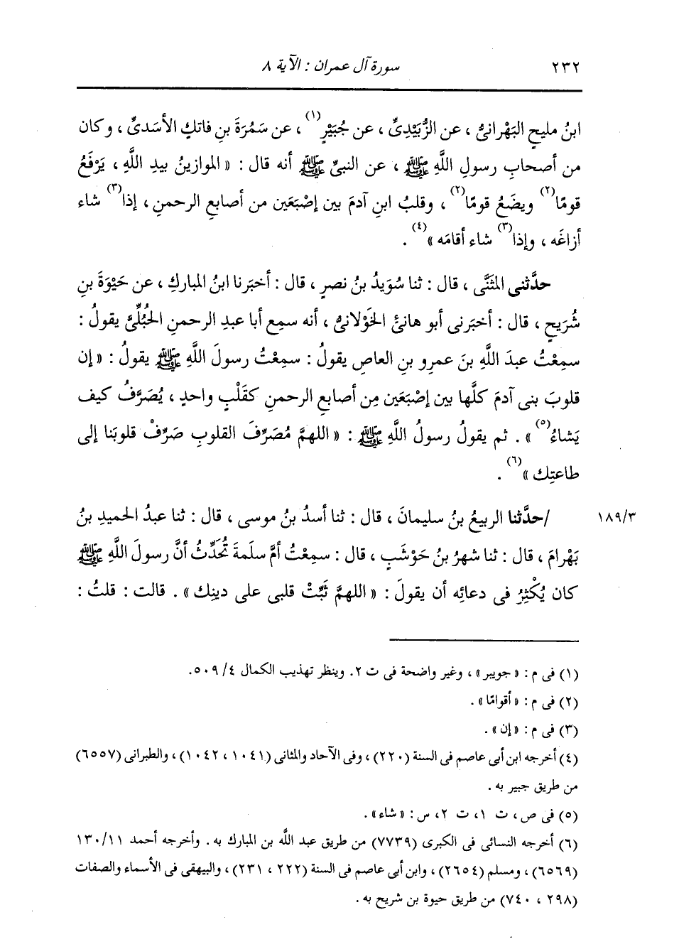 حَدَّثَنِي الْمُثَنَّى، قَالَ: ثنا سُوَيْدُ بْنُ نَصْرٍ، قَالَ أَخْبَرَنَا ابْنُ الْمُبَارَكِ، عَنْ حَيْوَةَ بْنِ شُرَيْحٍ، قَالَ: أَخْبَرَنِي أَبُو هَانِئٍ الْخَوْلَانِيُّ، أَنَّهُ سَمِعَ أَبَا عَبْدِ الرَّحْمَنِ الْحُبُلِيَّ، يَقُولُ سَمِعْتُ عَبْدَ اللَّهِ بْنَ عَمْرِو بْنِ الْعَاصِ، يَقُولُ سَمِعْتُ رَسُولَ اللَّهِ صَلَّى اللهُ عَلَيْهِ وَسَلَّمَ يَقُولُ: «إِنَّ §قُلُوبَ بَنِي آدَمَ كُلَّهَا بَيْنَ أُصْبُعَيْنِ مِنْ أَصَابِعِ الرَّحْمَنِ كَقَلْبٍ وَاحِدٍ يُصَرِّفُ كَيْفَ يَشَاءُ» ثُمَّ يَقُولُ رَسُولُ اللَّهِ صَلَّى اللهُ عَلَيْهِ وَسَلَّمَ: «اللَّهُمَّ مُصَرِّفَ الْقُلُوبِ صَرِّفْ قُلُوبَنَا إِلَى طَاعَتِكَ»