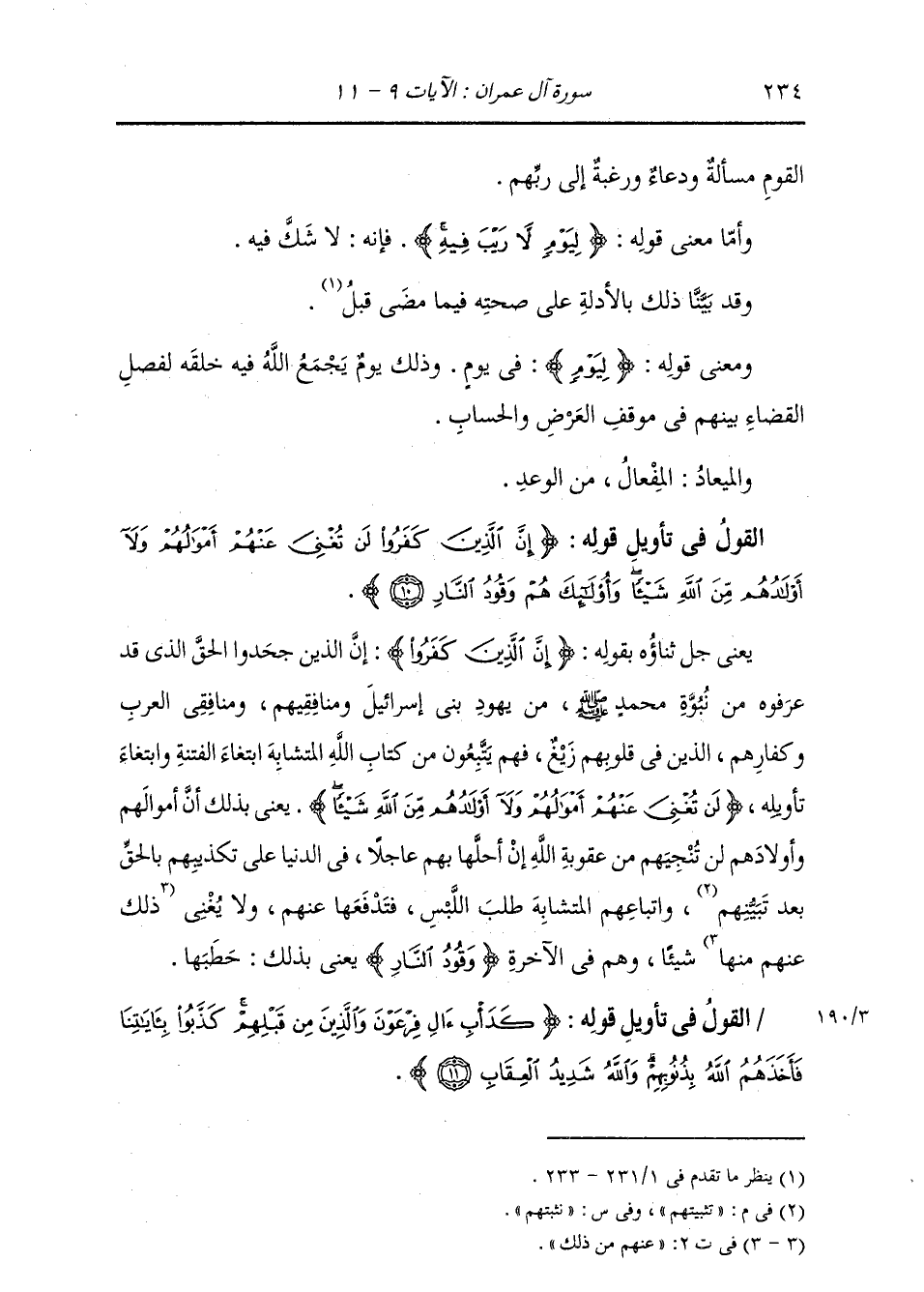 §الْقَوْلُ فِي تَأْوِيلِ قَوْلِهِ تَعَالَى: {إِنَّ الَّذِينَ كَفَرُوا لَنْ تُغْنِي عَنْهُمْ أَمْوَالُهُمْ وَلَا أَوْلَادُهُمْ مِنَ اللَّهِ شَيْئًا وَأُولَئِكَ هُمْ وَقُودُ النَّارِ} [آل عمران: 10] يَعْنِي جَلَّ ثناؤُهُ بِقَوْلِهِ: {إِنَّ الَّذِينَ كَفَرُوا} [البقرة: 6] إِنَّ الَّذِينَ جَحَدُوا الْحَقَّ الَّذِي قَدْ عَرَفُوهُ مِنْ نُبُوَّةِ مُحَمَّدٍ صَلَّى اللهُ عَلَيْهِ وَسَلَّمَ مِنْ يَهُودِ بَنِي إِسْرَائِيلَ وَمُنَافِقِيهِمْ، وَمُنَافِقِي الْعَرَبِ وَكُفَّارِهِمُ الَّذِينَ فِي قُلُوبِهِمْ زَيْغٌ، فَهُمْ يَتَّبِعُونَ مِنْ كِتَابِ اللَّهِ الْمُتَشَابِهَ ابْتِغَاءَ الْفِتْنَةِ وَابْتِغَاءَ تَأْوِيلِهِ {لَنْ تُغْنِيَ عَنْهُمْ أَمْوَالُهُمْ وَلَا أَوْلَادُهُمْ مِنَ اللَّهِ شَيْئًا} [آل عمران: 10] يَعْنِي بِذَلِكَ أَنَّ أَمْوَالَهُمْ وَأَوْلَادَهُمْ لَنْ تُنْجِيَهُمْ مِنْ عُقُوبَةِ اللَّهِ إِنْ أَحَلَّهَا بِهِمْ عَاجِلًا فِي الدُّنْيَا عَلَى تَكْذِيبِهِمْ بِالْحَقِّ بَعْدَ تَبَيُّنِهِمْ، وَاتِّبَاعَهِمُ الْمُتَشَابِهَ طَلَبَ اللُّبْسِ فَتَدْفَعَهَا عَنْهُمْ، وَلَا يُغْنِي ذَلِكَ عَنْهُمْ مِنْهَا شَيْئًا، {وَأُولَئِكَ هُمْ وَقُودُ النَّارِ} [آل عمران: 10] يَعْنِي بِذَلِكَ حَطَبَهَا
