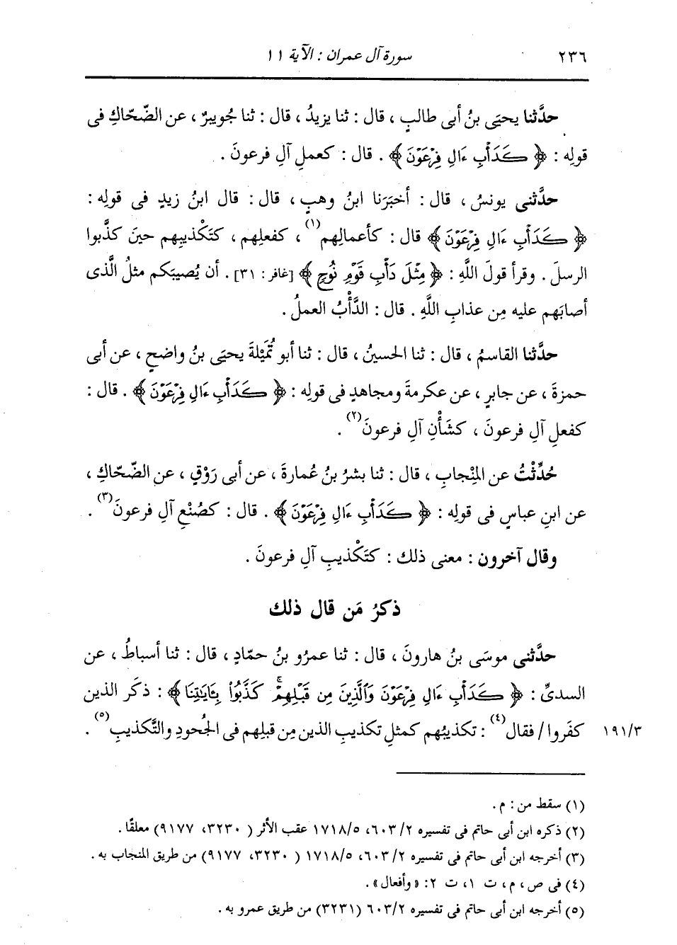 حُدِّثْتُ عَنِ المِنْجَابِ، قَالَ: ثنا بِشْرُ بْنُ عُمَارَةَ، عَنْ أَبِي رَوْقٍ، عَنِ الضَّحَّاكِ، عَنِ ابْنِ عَبَّاسٍ، فِي قَوْلِهِ: {§كَدَأْبِ آلِ فِرْعَوْنَ} [آل عمران: 11] قَالَ: «كَصُنْعِ آلِ فِرْعَوْنَ» وَقَالَ آخَرُونَ: مَعْنَى ذَلِكَ: كَتْكِذِيبِ آلِ فِرْعَوْنَ