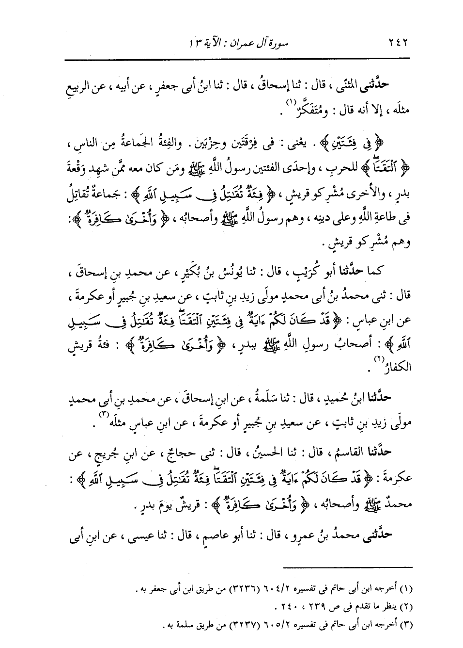 كَمَا: حَدَّثَنَا أَبُو كُرَيْبٍ، قَالَ: ثنا يُونُسُ بْنُ بُكَيْرٍ، عَنْ مُحَمَّدِ بْنِ إِسْحَاقَ، قَالَ: ثني مُحَمَّدُ بْنُ أَبِي مُحَمَّدٍ مَوْلَى زَيْدِ بْنِ ثَابِتٍ، عَنْ سَعِيدِ بْنِ جُبَيْرٍ أَوْ عِكْرِمَةَ، عَنِ ابْنِ عَبَّاسٍ: {§قَدْ كَانَ لَكُمْ آيَةٌ فِي فِئَتَيْنِ الْتَقَتَا فِئَةٌ تُقَاتِلُ فِي سَبِيلِ اللَّهِ} [آل عمران: 13] «أَصْحَابُ رَسُولِ اللَّهِ صَلَّى اللهُ عَلَيْهِ وَسَلَّمَ بِبَدْرٍ» ، {وَأُخْرَى كَافِرَةٌ} [آل عمران: 13] «فِئَةُ قُرَيْشٍ الْكُفَّارُ» حَدَّثَنَا ابْنُ حُمَيْدٍ، قَالَ: ثنا سَلَمَةُ، عَنِ ابْنِ إِسْحَاقَ، عَنْ مُحَمَّدِ بْنِ أَبِي مُحَمَّدٍ مَوْلَى زَيْدِ بْنِ ثَابِتٍ، عَنْ سَعِيدِ بْنِ جُبَيْرٍ أَوْ عِكْرِمَةَ، عَنِ ابْنِ عَبَّاسٍ، مِثْلَهُ