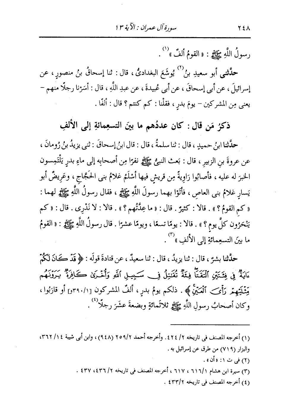 حَدَّثَنَا بِشْرٌ، قَالَ: ثنا يَزِيدُ، قَالَ: ثنا سَعِيدٌ، عَنْ قَتَادَةَ، قَوْلُهُ: {§قَدْ كَانَ لَكُمْ آيَةٌ فِي فِئَتَيْنِ الْتَقَتَا فِئَةٌ تُقَاتِلُ فِي سَبِيلِ اللَّهِ وَأُخْرَى كَافِرَةٌ يَرَوْنَهُمْ مِثْلَيْهِمْ رَأْيَ الْعَيْنِ} [آل عمران: 13] «ذَلِكُمْ يَوْمَ بَدْرٍ أَلَّفَ الْمُشْرِكُونِ، أَوْ قَارِبُوا، وَكَانَ أَصْحَابُ رَسُولِ اللَّهِ صَلَّى اللهُ عَلَيْهِ وَسَلَّمَ ثَلَاثَمِائَةٍ وَبِضْعَةَ عَشَرَ رَجُلًا»