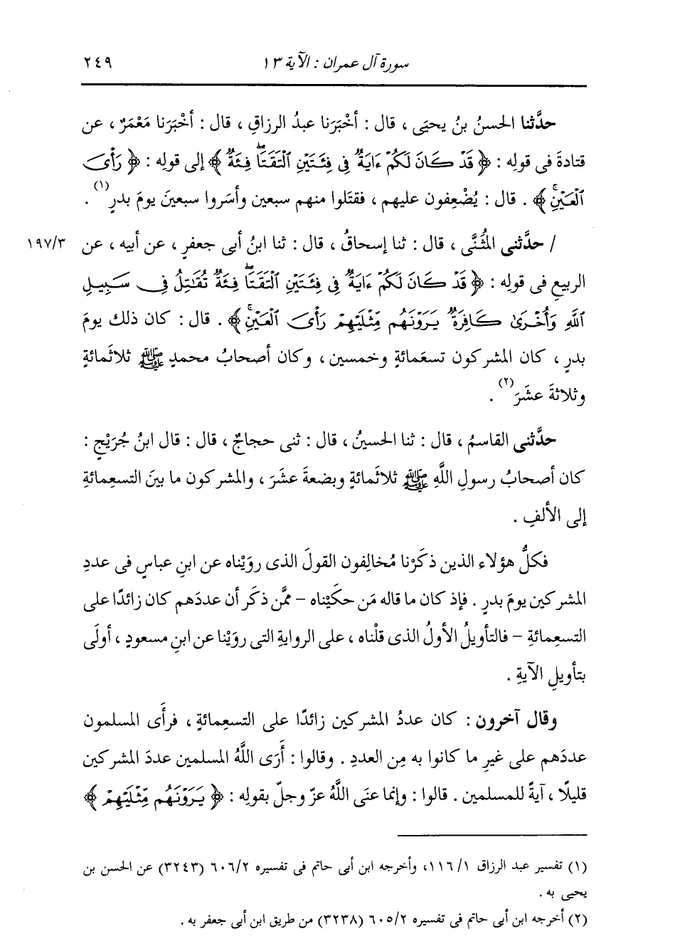 حَدَّثَنَا الْمُثَنَّى، قَالَ: ثنا إِسْحَاقُ، قَالَ: ثنا ابْنُ أَبِي جَعْفَرٍ، عَنْ أَبِيهِ، عَنِ الرَّبِيعِ، فِي قَوْلِهِ: {§قَدْ كَانَ لَكُمْ آيَةٌ فِي فِئَتَيْنِ الْتَقَتَا فِئَةٌ تُقَاتِلُ فِي سَبِيلِ اللَّهِ وَأُخْرَى كَافِرَةٌ يَرَوْنَهُمْ مِثْلَيْهِمْ رَأْيَ الْعَيْنِ} [آل عمران: 13] قَالَ: «كَانَ ذَلِكَ يَوْمَ بَدْرٍ، وَكَانَ الْمُشْرِكُونَ تِسْعَمِائَةٍ وَخَمْسِينَ، وَكَانَ أَصْحَابُ مُحَمَّدٍ صَلَّى اللهُ عَلَيْهِ وَسَلَّمَ ثَلَاثَمِائَةٍ وَثَلَاثَةَ عَشَرَ»