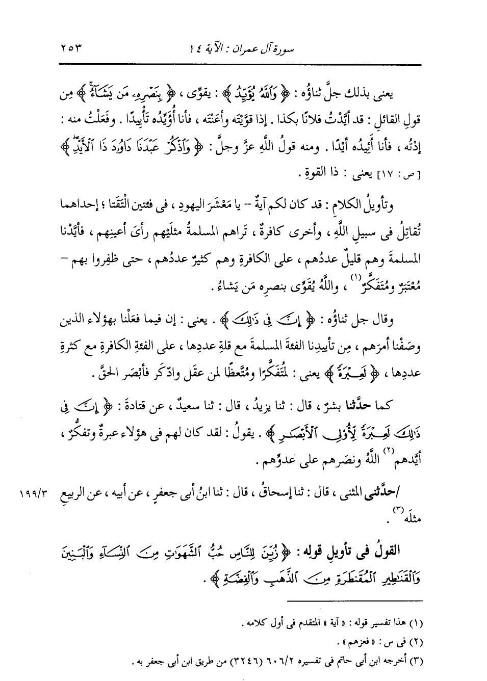 يَعْنِي بِقَوْلِهِ جَلَّ ثناؤُهُ: {وَاللَّهُ يُؤَيِّدُ} [آل عمران: 13] يُقَوِّي بِنَصْرِهِ مَنْ يَشَاءُ، مِنْ قَوْلِ الْقَائِلِ: قَدْ أَيَّدْتُ فُلَانًا بِكَذَا: إِذَا قَوَّيْتُهُ وَأَعَنْتُهُ، فَأَنَا أُؤَيِّدُهُ تَأْيِيدًا، و «فَعَلْتُ» مِنْهُ: إِدْتُهُ فَأَنَا أَئِيدُهُ أَيْدًا؛ وَمِنْهُ قَوْلُ اللَّهِ عَزَّ وَجَلَّ: {وَاذْكُرْ عَبْدَنَا دَاوُدَ ذَا الْأَيْدِ} ، يَعْنِي ذَا الْقُوَّةِ. وَتَأْوِيلُ الْكَلَامِ: قَدْ كَانَ لَكُمْ آيَةٌ يَا مَعْشَرَ الْيَهُودِ فِي فِئَتَيْنِ الْتَقَتَا: إِحْدَاهُمَا تُقَاتِلُ فِي سَبِيلِ اللَّهِ، وَأُخْرَى كَافِرَةٌ، يَرَاهُمُ الْمُسْلِمُونَ مِثْلَيْهِمْ رَأْيَ أَعْيُنِهِمْ، فَأَيَّدْنَا الْمُسْلِمَةَ وَهُمْ قَلِيلٌ عَدَدُهُمْ، عَلَى الْكَافِرَةِ وَهُمْ كَثِيرٌ عَدَدُهُمْ حَتَّى ظَفِرُوا بِهِمْ مُعْتَبَرٌ وَمُتَفَكَّرٌ، وَاللَّهُ يُقَوِّي بِنَصْرِهِ مَنْ يَشَاءُ، وَقَالَ جَلَّ ثناؤُهُ: إِنَّ فِي ذَلِكَ: يَعْنِي إِنَّ فِيمَا فَعَلْنَا بِهَؤُلَاءِ الَّذِينَ وَصَفْنَا أَمْرَهُمْ مِنْ تَأْيِيدِنَا الْفِئَةَ الْمُسْلِمَةَ مَعَ قِلَّةِ عَدَدِهِمْ، عَلَى الْفِئَةِ الْكَافِرَةِ مَعَ كَثْرَةِ عَدَدِهَا {لَعِبْرَةً} [آل عمران: 13] يَعْنِي لَمُتَفَكَّرًا وَمُتَّعَظًا لِمَنْ عَقَلَ وَادَّكَرَ فَأَبْصَرَ الْحَقَّ