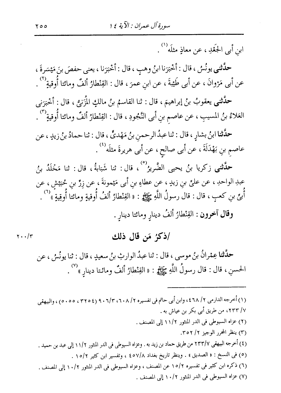 ذِكْرُ مَنْ قَالَ ذَلِكَ: حَدَّثَنَا عِمْرَانُ بْنُ مُوسَى، قَالَ: ثنا عَبْدُ الْوَارِثِ بْنُ سَعِيدٍ، قَالَ: ثنا يُونُسُ، عَنِ الْحَسَنِ، قَالَ: قَالَ رَسُولُ اللَّهِ صَلَّى اللهُ عَلَيْهِ وَسَلَّمَ: «§الْقِنْطَارُ أَلْفٌ وَمِائَتَا دِينَارٍ»