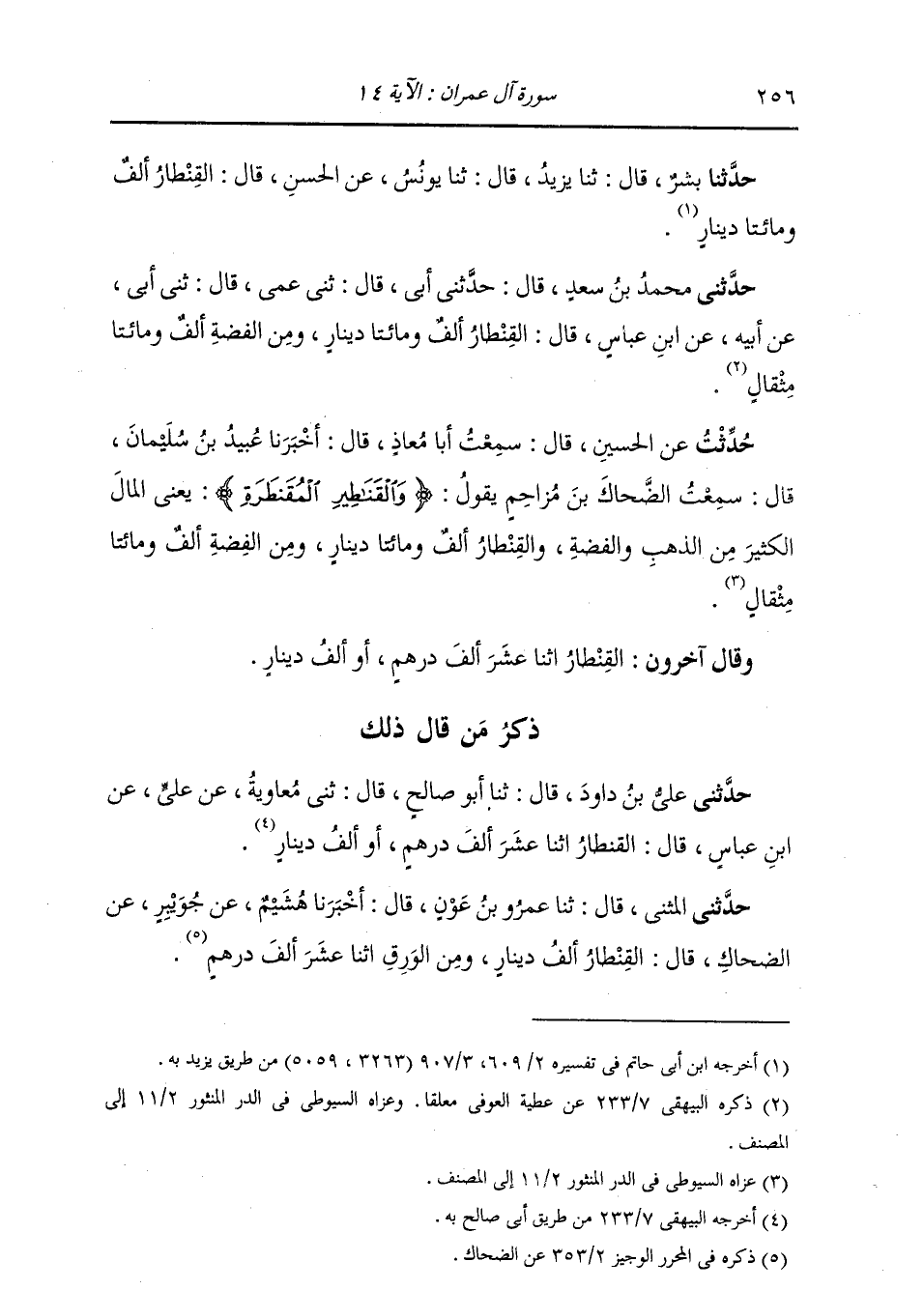 حُدِّثْتُ عَنِ الْحُسَيْنِ، قَالَ: سَمِعْتُ أَبَا مُعَاذٍ، قَالَ: أَخْبَرَنَا عُبَيْدُ بْنُ سَلْمَانَ، قَالَ: سَمِعْتُ الضَّحَّاكَ بْنَ مُزَاحِمٍ، يَقُولُ: «§الْقَنَاطِيرُ الْمُقَنْطَرَةُ، يَعْنِي الْمَالَ الْكَثِيرَ مِنَ الذَّهَبِ وَالْفِضَّةِ، وَالْقِنْطَارُ أَلْفٌ وَمِائَتَا دِينَارٍ، وَمِنَ الْفِضَّةِ أَلْفٌ وَمِائَتَا مِثْقَالٍ» وَقَالَ آخَرُونَ: الْقِنْطَارُ اثْنَا عَشَرَ أَلْفَ دِرْهَمٍ، أَوْ أَلْفُ دِينَارٍ
