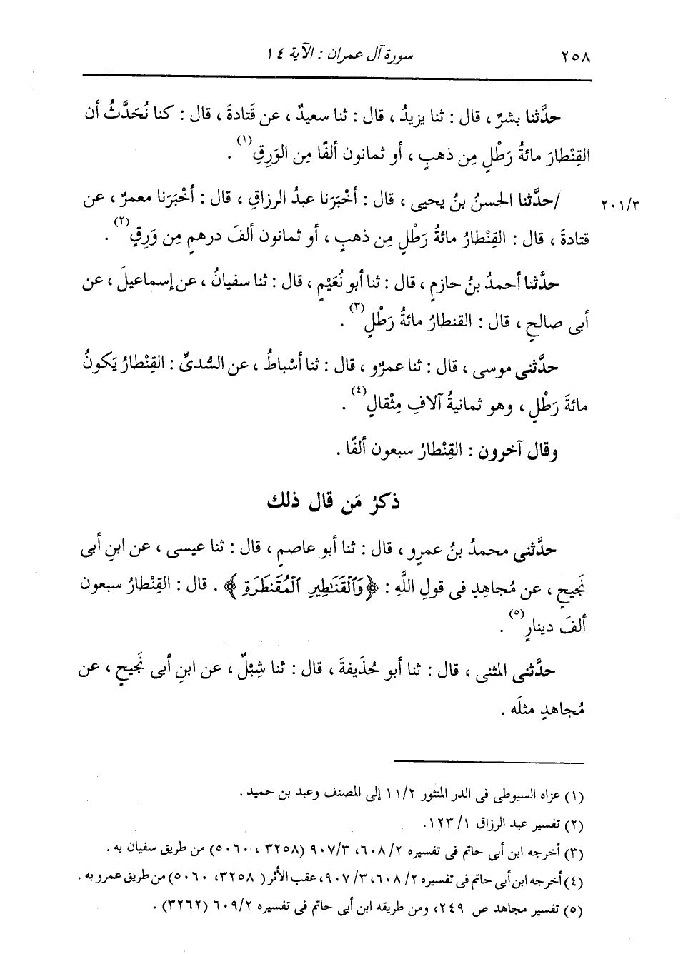حَدَّثَنَا بِشْرٌ، قَالَ: ثنا يَزِيدُ، قَالَ: ثنا سَعِيدٌ، عَنْ قَتَادَةَ، قَالَ: «كُنَّا نُحَدِّثُ أَنَّ §الْقِنْطَارَ، مِائَةُ رِطْلٍ مِنْ ذَهَبٍ، أَوْ ثَمَانُونَ أَلْفًا مِنَ الْوَرِقِ»