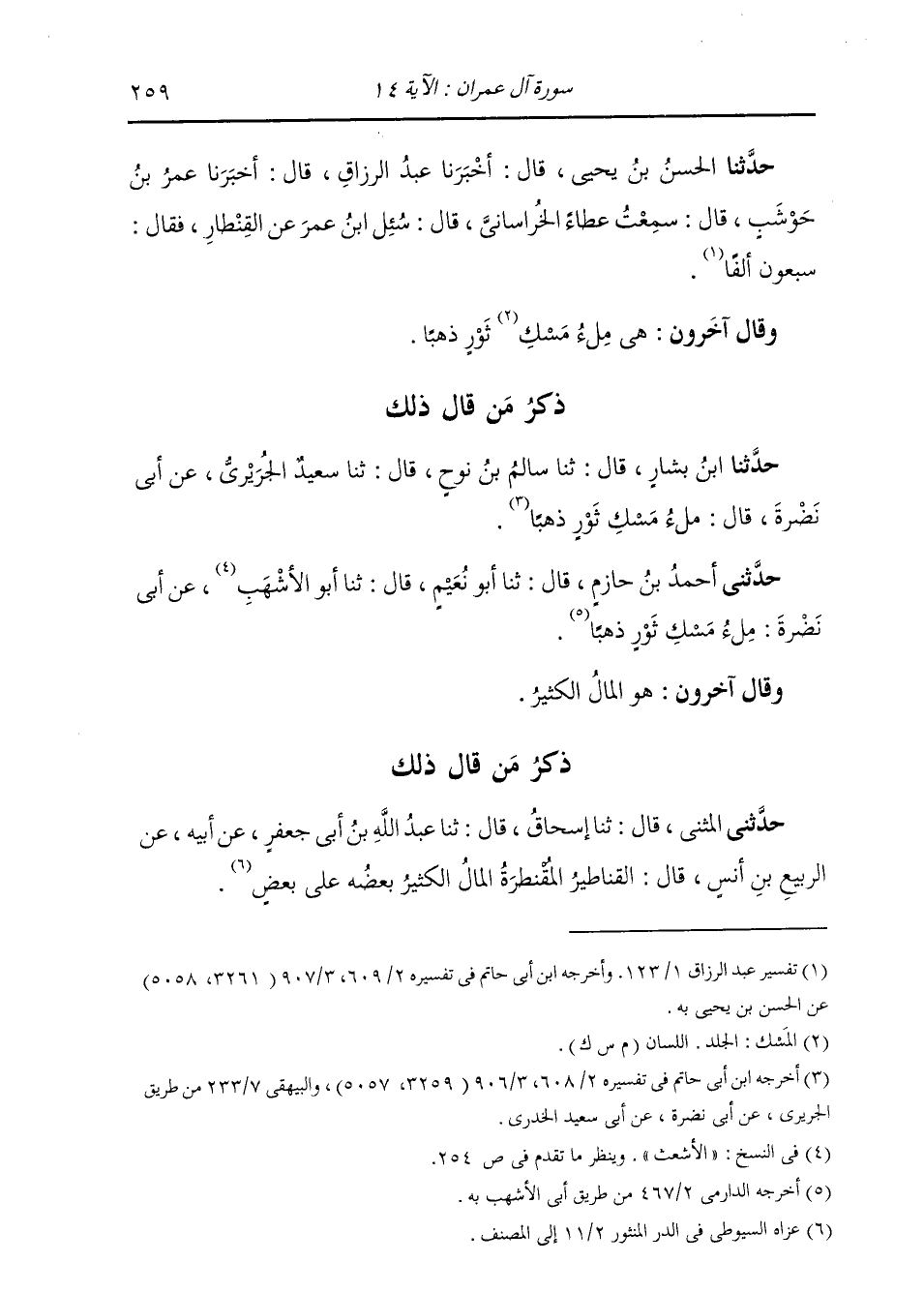 ذِكْرُ مَنْ قَالَ ذَلِكَ: حَدَّثَنِي الْمُثَنَّى، قَالَ: ثنا إِسْحَاقُ، قَالَ: ثنا عَبْدُ اللَّهِ بْنُ أَبِي جَعْفَرٍ، عَنْ أَبِيهِ، عَنِ الرَّبِيعِ بْنِ أَنَسٍ، قَالَ: {§الْقَنَاطِيرِ الْمُقَنْطَرَةِ} [آل عمران: 14] «الْمَالُ الْكَثِيرُ بَعْضُهُ عَلَى بَعْضٍ» -[260]- وَقَدْ ذَكَرَ بَعْضُ أَهْلِ الْعِلْمِ بِكَلَامِ الْعَرَبِ أَنَّ الْعَرَبَ لَا تُحِدُّ الْقِنْطَارَ بِمِقْدَارٍ مَعْلُومٍ مِنَ الْوَزْنِ، وَلَكِنَّهَا تَقُولُ: هُوَ قَدْرُ وَوَزْنٍ، وَقَدْ يَنْبَغِي أَنْ يَكُونَ ذَلِكَ كَذَلِكَ؛ لِأَنَّ ذَلِكَ لَوْ كَانَ مَحْدُودًا قَدْرُهُ عِنْدَهَا لَمْ يَكُنْ بَيْنَ مُتَقَدِّمِي أَهْلِ التَّأْوِيلِ فِيهِ كُلُّ هَذَا الِاخْتِلَافِ. فَالصَّوَابُ فِي ذَلِكَ أَنْ يُقَالَ: هُوَ الْمَالُ الْكَثِيرُ، كَمَا قَالَ الرَّبِيعُ بْنُ أَنَسٍ، وَلَا يُحَدُّ قَدْرُ وَزْنِهِ بِحَدٍّ عَلَى تَعَنُّفٍ، وَقَدْ قِيلَ مَا قِيلَ مِمَّا رَوَيْنَا، وَأَمَّا الْمُقَنْطَرَةُ: فَهِيَ الْمُضَعَّفَةُ، وَكَأَنَّ الْقَنَاطِيرَ ثَلَاثَةٌ وَالْمُقَنْطَرَةُ تِسْعَةٌ، وَهُوَ كَمَا قَالَ الرَّبِيعُ بْنُ أَنَسٍ: الْمَالُ الْكَثِيرُ بَعْضُهُ عَلَى بَعْضٍ