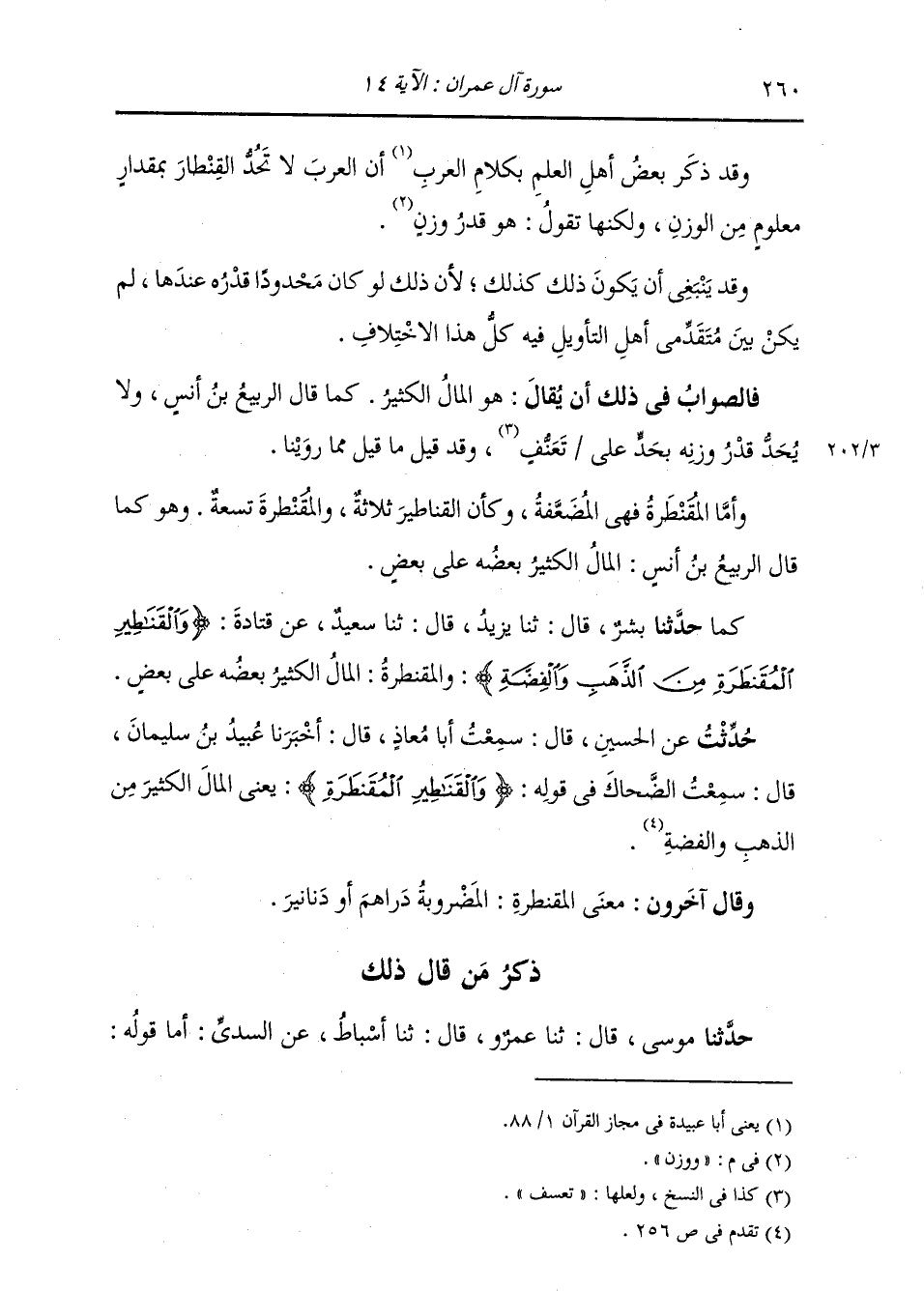 ذِكْرُ مَنْ قَالَ ذَلِكَ: حَدَّثَنَا مُوسَى، قَالَ: ثنا عَمْرٌو، قَالَ: ثنا أَسْبَاطٌ، عَنِ السُّدِّيِّ: أَمَّا قَوْلُهُ -[261]-: {§الْمُقَنْطَرَةِ} [آل عمران: 14] فَيَقُولُ: «الْمَضْرُوبَةُ حَتَّى صَارَتْ دَنَانِيرَ أَوْ دَرَاهِمَ» وَقَدْ رُوِيَ عَنِ النَّبِيِّ صَلَّى اللهُ عَلَيْهِ وَسَلَّمَ فِي قَوْلِهِ: {وَآتَيْتُمْ إِحْدَاهُنَّ قِنْطَارًا} [النساء: 20] خَبَرٌ لَوْ صَحَّ سَنَدُهُ لَمْ نَعْدُهُ إِلَى غَيْرِهِ