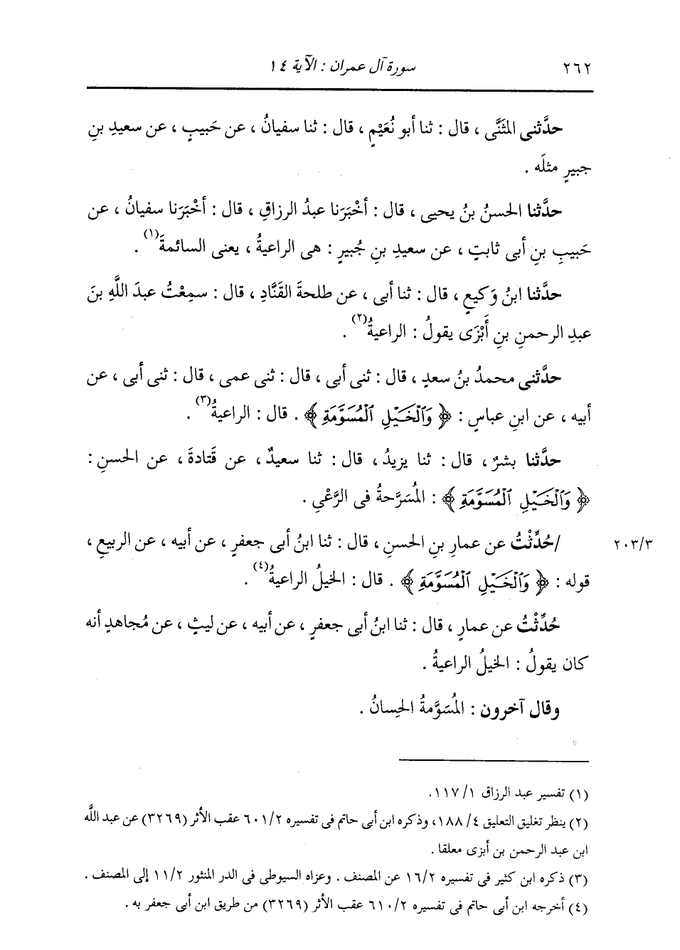 حُدِّثْتُ عَنْ عَمَّارِ بْنِ الْحَسَنِ، قَالَ: ثنا ابْنُ أَبِي جَعْفَرٍ، عَنْ أَبِيهِ، عَنِ الرَّبِيعِ، قَوْلُهُ: {§وَالْخَيْلِ الْمُسَوَّمَةِ} [آل عمران: 14] قَالَ: «الْخَيْلُ الرَّاعِيَةُ»