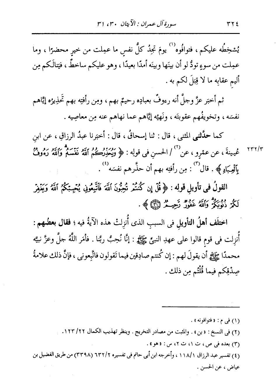 حَدَّثَنِي الْمُثَنَّى، قَالَ: ثنا إِسْحَاقُ، قَالَ: أَخْبَرَنَا عَبْدُ الرَّزَّاقِ، عَنِ ابْنِ عُيَيْنَةَ، عَنْ عَمْرِو بْنِ الْحَسَنِ، فِي قَوْلِهِ: {§وَيُحَذِّرُكُمُ اللَّهُ نَفْسَهُ وَاللَّهُ رَءُوفٌ بِالْعِبَادِ} قَالَ: «مِنْ رَأْفَتِهِ بِهِمْ أَنْ حَذَّرَهُمْ نَفْسَهُ»