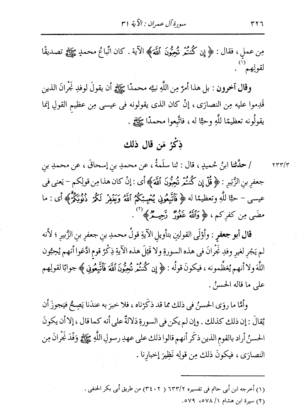 ذِكْرُ مَنْ قَالَ ذَلِكَ: حَدَّثَنَا ابْنُ حُمَيْدٍ، قَالَ: ثنا سَلَمَةُ، عَنْ مُحَمَّدِ بْنِ إِسْحَاقَ، عَنْ مُحَمَّدِ بْنِ جَعْفَرِ بْنِ الزُّبَيْرِ {§قُلْ إِنْ كُنْتُمْ تُحِبُّونَ اللَّهَ} [آل عمران: 31] «أَيْ إِنْ كَانَ هَذَا مِنْ قَوْلَكُمْ - يَعْنِي فِي عِيسَى - حُبًّا لِلَّهِ وَتَعْظِيمًا لَهُ» {فَاتَّبِعُونِي يُحْبِبْكُمُ اللَّهُ وَيَغْفِرْ لَكُمْ ذُنُوبَكُمْ} [آل عمران: 31] «أَيْ مَا مَضَى مِنْ كُفْرِكُمْ» {وَاللَّهُ غَفُورٌ رَحِيمٌ} [البقرة: 218] قَالَ أَبُو جَعْفَرٍ: وَأَوْلَى الْقَوْلَيْنِ بِتَأْوِيلِ الْآيَةِ قَوْلُ مُحَمَّدِ بْنِ جَعْفَرِ بْنِ الزُّبَيْرِ؛ لِأَنَّهُ لَمْ يَجُزْ لِغَيْرِ وَفْدِ نَجْرَانَ فِي هَذِهِ السُّورَةِ، وَلَا قَبْلَ هَذِهِ الْآيَةِ ذِكْرُ قَوْمٍ ادَّعُوا أَنَّهُمْ يُحِبُّونَ اللَّهَ، وَلَا أَنَّهُمْ يُعَظِّمُونَهُ، فَيَكُونُ قَوْلُهُ {إِنْ كُنْتُمْ تُحِبُّونَ اللَّهَ فَاتَّبِعُونِي} [آل عمران: 31] جَوَابًا لِقَوْلِهِمْ عَلَى مَا قَالَهُ الْحَسَنُ. وَأَمَّا مَا رَوَى الْحَسَنُ فِي ذَلِكَ مِمَّا قَدْ ذَكَرْنَاهُ، فَلَا خَبَرَ بِهِ عِنْدَنَا يَصِحُّ، فَيَجُوزُ أَنْ يُقَالَ: إِنَّ ذَلِكَ كَذَلِكَ، وَإِنْ لَمْ يَكُنْ فِي السُّورَةِ دَلَالَةٌ عَلَى أَنَّهُ كَمَا قَالَ إِلَّا أَنْ يَكُونَ الْحَسَنُ أَرَادَ بِالْقَوْمِ الَّذِينَ ذَكَرَ أَنَّهُمْ قَالُوا ذَلِكَ عَلَى عَهْدِ رَسُولِ اللَّهِ صَلَّى اللهُ عَلَيْهِ وَسَلَّمَ وَفْدَ نَجْرَانَ مِنَ النَّصَارَى، فَيَكُونُ ذَلِكَ مِنْ قَوْلِهِ نَظِيرُ إِخْبَارِنَا،