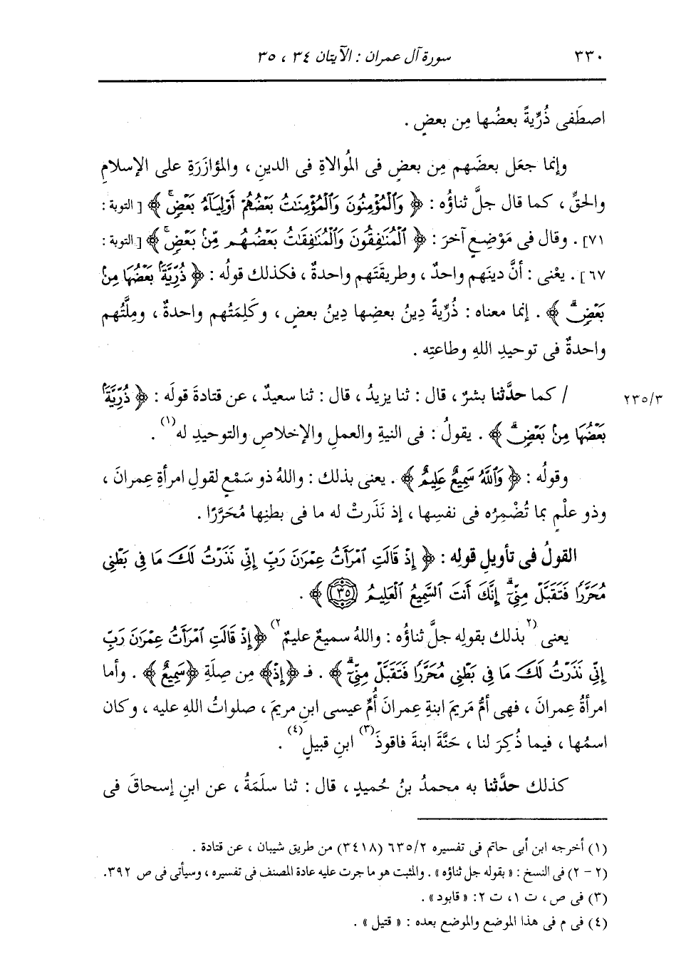 كَمَا: حَدَّثَنَا بِشْرٌ، قَالَ: ثنا يَزِيدُ، قَالَ: ثنا سَعِيدٌ، عَنْ قَتَادَةَ، قَوْلُهُ: {§ذُرِّيَّةً بَعْضُهَا مِنْ بَعْضٍ} [آل عمران: 34] يَقُولُ: «فِي النِّيَّةِ وَالْعَمَلِ وَالْإِخْلَاصِ وَالتَّوْحِيدِ لَهُ» وَقَوْلُهُ: {وَاللَّهُ سَمِيعٌ عَلِيمٌ} [آل عمران: 34] يَعْنِي بِذَلِكَ: وَاللَّهُ ذُو سَمْعٍ لِقَوْلِ امْرَأَةِ عِمْرَانَ، وَذُو عِلْمٍ بِمَا تُضْمِرُهُ فِي نَفْسِهَا، إِذْ نَذَرَتْ لَهُ مَا فِي بَطْنِهَا مُحَرَّرًا