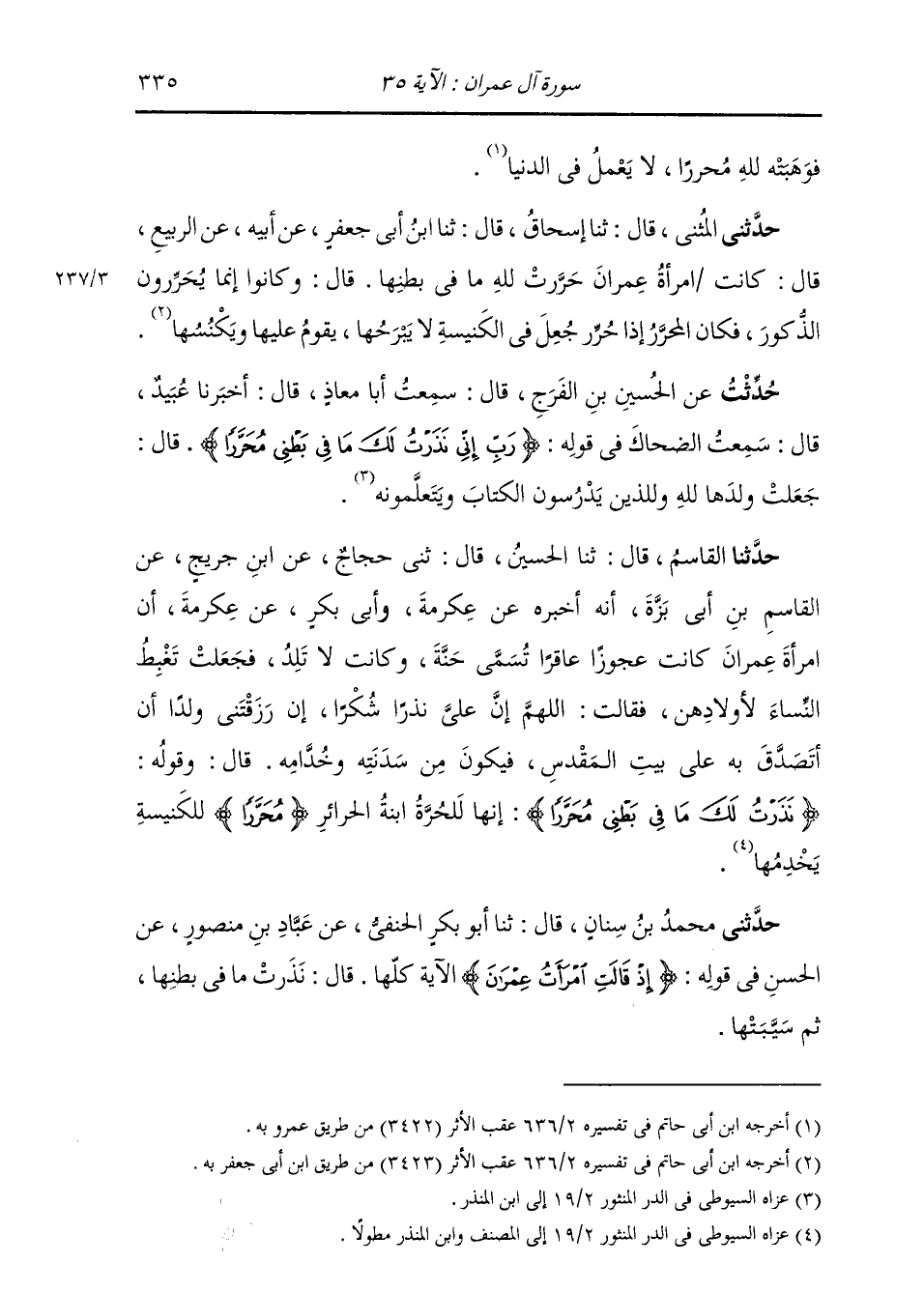 حَدَّثَنِي الْمُثَنَّى، قَالَ: ثنا إِسْحَاقُ، قَالَ: ثنا ابْنُ أَبِي جَعْفَرٍ، عَنْ أَبِيهِ، عَنِ الرَّبِيعِ، قَالَ: " كَانَتِ §امْرَأَةُ عِمْرَانَ حَرَّرَتْ لِلَّهِ مَا فِي بَطْنِهَا، قَالَ: وَكَانُوا إِنَّمَا يُحَرِّرُونَ الذُّكُورَ، فَكَانَ الْمُحَرَّرُ إِذَا حُرِّرَ جُعِلَ فِي الْكَنِيسَةِ لَا يَبْرَحُهَا، يَقُومُ عَلَيْهَا وَيَكْنُسُهَا "