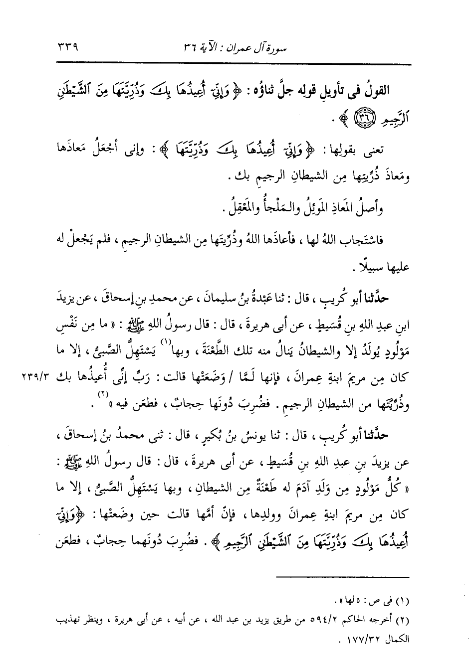 حَدَّثَنَا أَبُو كُرَيْبٍ، قَالَ: ثنا يُونُسُ بْنُ بُكَيْرٍ، قَالَ: ثني مُحَمَّدُ بْنُ إِسْحَاقَ، عَنْ يَزِيدَ بْنِ عَبْدِ اللَّهِ بْنِ قُسَيْطٍ، عَنْ أَبِي هُرَيْرَةَ، قَالَ: قَالَ رَسُولُ اللَّهِ صَلَّى اللهُ عَلَيْهِ وَسَلَّمَ: " §كُلُّ مَوْلُودٍ مِنْ وَلَدِ آدَمَ لَهُ طَعْنَةٌ مِنَ الشَّيْطَانِ، وَبِهَا يَسْتَهِلُّ الصَّبِيُّ؛ إِلَّا مَا كَانَ مِنْ مَرْيَمَ ابْنَةِ عِمْرَانَ وَوَلَدِهَا، فَإِنَّ أُمَّهَا قَالَتْ حِينَ وَضَعَتْهَا: {إِنِّي أُعِيذُهَا بِكَ وَذُرِّيَّتَهَا مِنَ الشَّيْطَانِ الرَّجِيمِ} [آل عمران: 36] فَضُرِبَ دُونَهُمَا حِجَابٌ فَطَعَنَ -[340]- فِي الْحِجَابِ " حَدَّثَنَا ابْنُ حُمَيْدٍ، قَالَ: ثنا سَلَمَةُ، قَالَ: ثني مُحَمَّدُ بْنُ إِسْحَاقَ، عَنْ يَزِيدَ بْنِ عَبْدِ اللَّهِ بْنِ قُسَيْطٍ، عَنْ أَبِي هُرَيْرَةَ، عَنْ رَسُولِ اللَّهِ صَلَّى اللهُ عَلَيْهِ وَسَلَّمَ، بِنَحْوِهِ